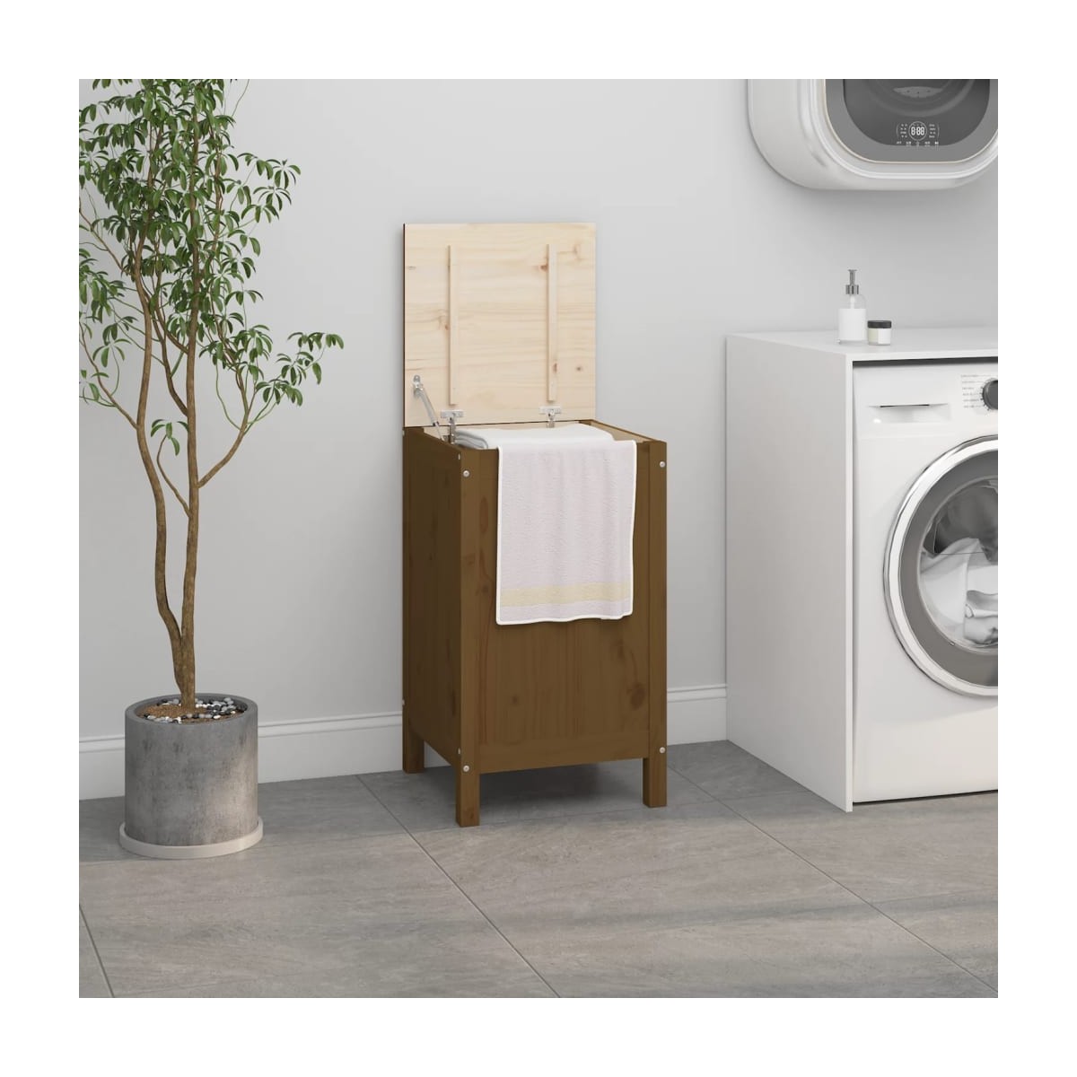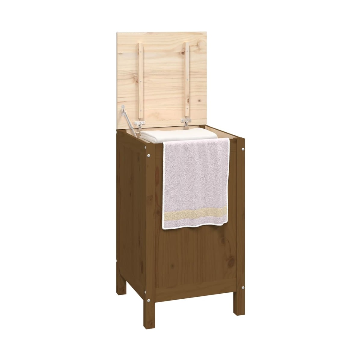 Este baúl para la colada desprende un encanto natural y constituye un magnífico complemento decorativo para el cuarto de baño. Madera de pino maciza: La madera de pino maciza es un bonito material natural. La madera de pino tiene vetas rectas, y los nudos dan al material su distintivo aspecto rústico.Amplio espacio de almacenamiento: Este cesto de la colada está diseñado con 1 sección grande para ayudarte a clasificar la colada o almacenar otros artículos de forma organizada, como juguetes de niños, cojines, etc.Tapa hidráulica elevable a gas: Puedes abrir y cerrar la tapa fácilmente con el elevador hidráulico a gasPatas de madera: Las patas de madera confieren al cesto de la ropa un aspecto natural y agradable, al mismo tiempo que garantizan su estabilidad. Combina bien con cualquier decoración de interior. Nota:Cada producto viene con un manual de montaje en la caja para facilitar el montaje.