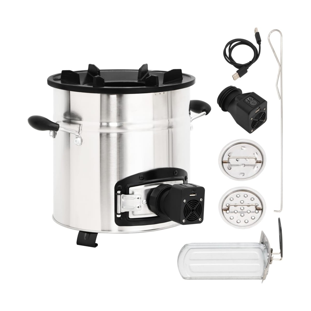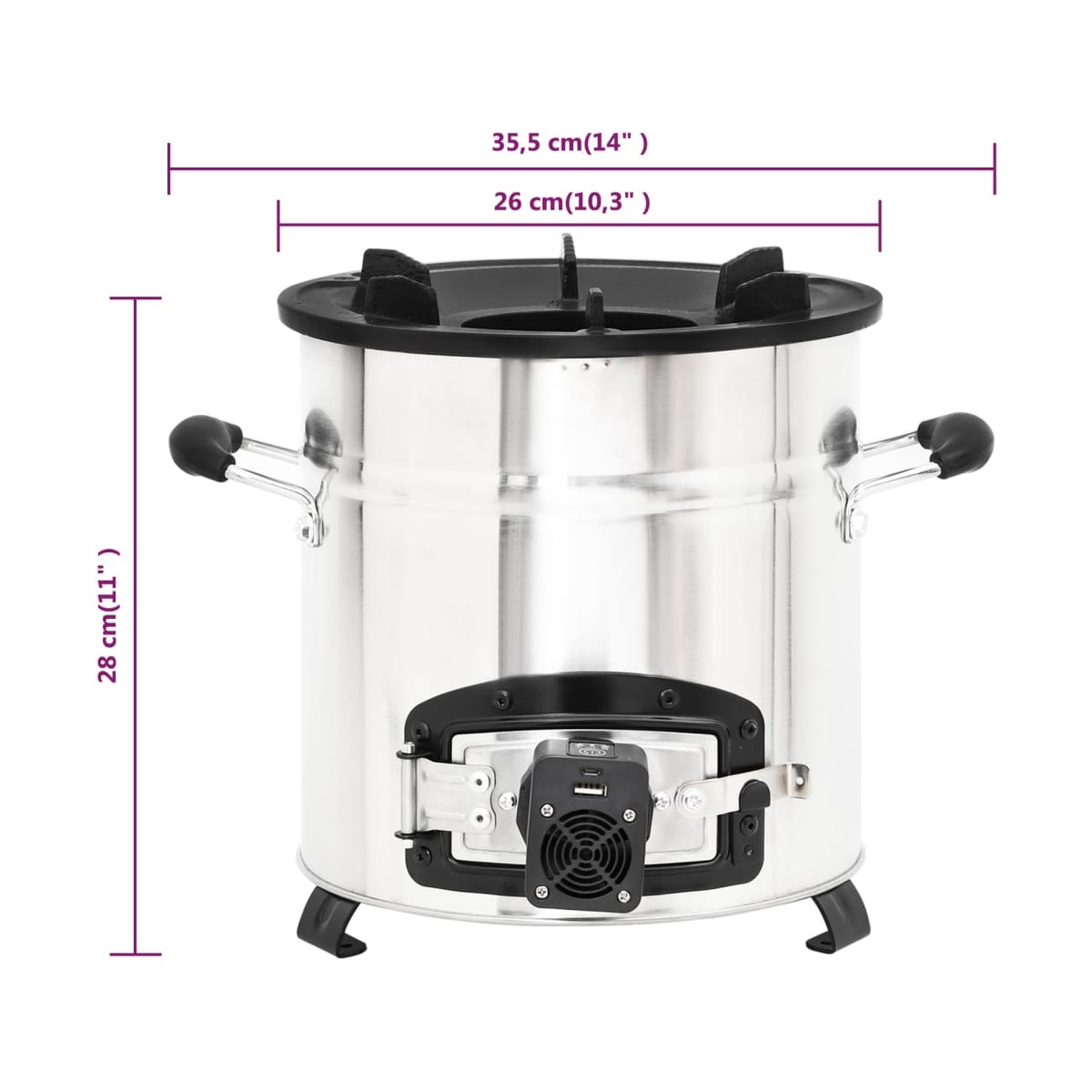 Esta cocina de leña con ventilador USB sirve como utensilio de cocina cuando se realizan actividades al aire libre, además de generar más calidez y un ambiente acogedor cuando hace frío. Ahorro de energía: Esta parrilla de carbón utiliza madera, ramas, hojas, carbón o combustible de biomasa sólida. La cámara de combustión vertical totalmente aislada obliga a los gases a mezclarse con las llamas y así se reducen las emisiones nocivas y se aumenta la eficacia del combustible.Hornillo de hierro fundido: La chimenea cuenta con una estructura duradera de hierro fundido de seis puntas. El diseño de bajo perfil reduce el riesgo de astillamiento y puede soportar una variedad de utensilios de cocina para satisfacer todas tus necesidades de cocina al aire libre.Ventilador portátil: El ventilador de la cocina, con 3 modos de funcionamiento, puede calentar la cocina de leña rápidamente. Así no tendrás que soplar con la boca. Puedes gestionar la potencia del fuego pulsando el botón una o más veces.Diseño con puerta: El hornillo de camping también está diseñada con una puerta en la parte inferior, que se usa para montar el ventilador. Además, puedes retirar la ceniza fría del agujero usando el cenicero.Prácticas asas: La estufa de exterior para camping está equipada con 2 asas, para que puedas mover la estufa de forma segura. Nota:El ventilador funciona por USB y el adaptador USB no está incluido.Cada producto viene con un manual de montaje en la caja para facilitar el montaje y el uso.El producto sólo debe utilizarse en el exterior.Para evitar lesiones y quemaduras, no toques el producto cuando todavía haya madera ardiendo en su interior o poco después.