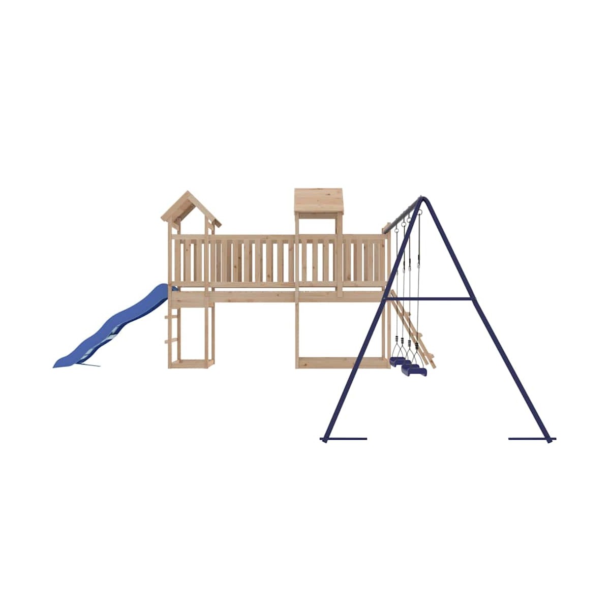 ¿Quieres que tus hijos jueguen en casa libremente? ¡Este set de parque infantil de madera transformará tu patio en un parque de recreo para tener las mejores aventuras imaginativas! Material duradero: Este parque infantil con tobogán está hecho de madera maciza de pino. La madera maciza de pino es un bonito material natural. La madera de pino tiene vetas rectas, y los nudos dan al material su distintivo aspecto rústico.Estructura robusta y estable: La estructura de madera de la estructura para trepar de jardín garantiza robustez y estabilidad. Además, las patas en forma de A del columpio infantil permiten el equilibrio.Centros de actividades múltiples: El parque infantil cuenta con una plataforma de 90 cm de altura y destaca por el tobogán ondulado, los columpios, la escalera y los areneros. Tus pequeños también pueden invitar a sus amigos a unirse a la diversión. Diseño cuidadoso: Las barandillas de madera circundantes están diseñadas para garantizar la seguridad de los niños durante su juego feliz. Además, el techo de madera da sombra a tus hijos en los calurosos días de verano.Diversión sin fin: ¡Esta casita infantil de madera para jardín ofrece mucha diversión y es la manera perfecta para que tus hijos y tus amigos disfruten, interactúen más y creen recuerdos todos juntos! Advertencia:Solo para uso domesticoUso al aire libre No adecuado para niños menores de 3 años Edad de usuario recomendada: de 3 a 8 años Nota:El producto debe anclarse para reducir posibles vuelcos. Los anclajes no están incluidos. Información útil:La entrega solo incluye el tobogán, la casa de juegos no está incluida.Para facilitar al máximo el montaje, cada producto se entrega con un manual.