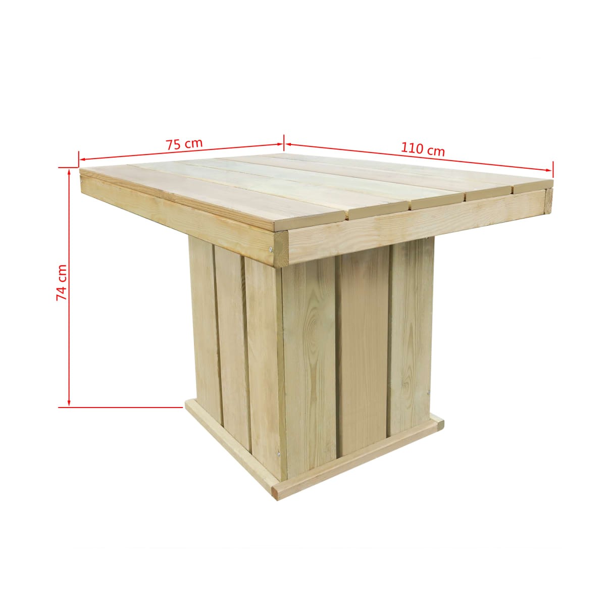 Este conjunto de muebles de jardín clásico de madera, que consta de 1 mesa y 4 sillas, agregará un toque de encanto rústico a tu patio u otro espacio al aire libre. El conjunto de muebles de jardín está hecho de madera de pino impregnada que es resistente a la putrefacción y muy duradera, por lo que es muy adecuada para uso en exteriores. Las sillas brindan un gran soporte y comodidad de asiento, mientras que la resistente y robusta mesa es ideal para colocar bebidas, comida y otros artículos. ¡Tómate un descanso en este precioso juego de muebles de jardín! El montaje es fácil. Ten en cuenta que la madera es un producto natural y puede presentar imperfecciones.