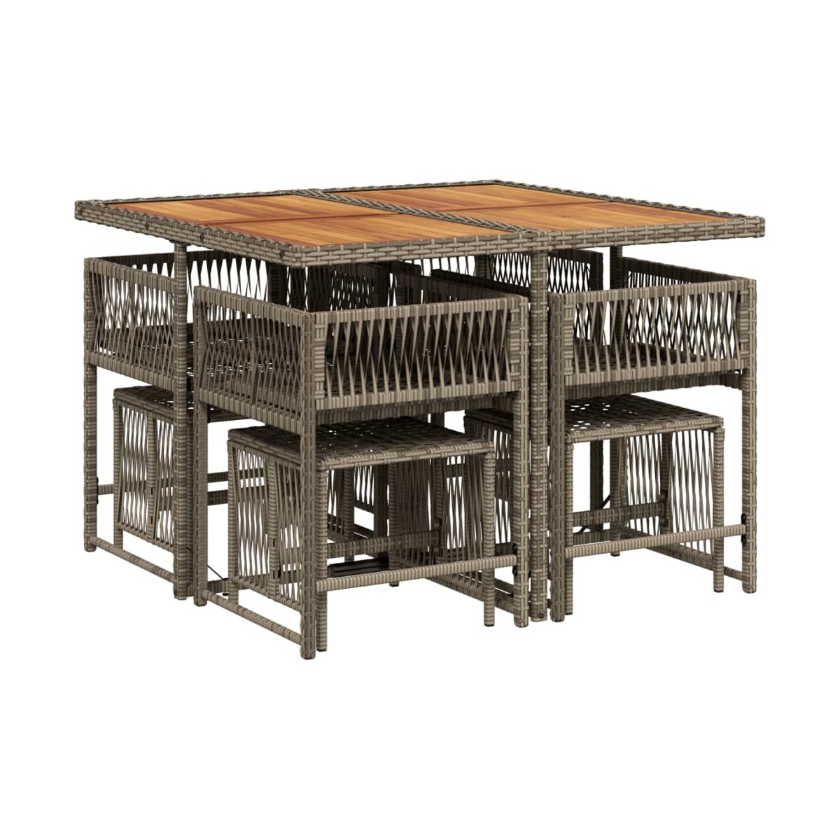 Este juego de comedor de jardín es una gran elección para comer al aire libre o simplemente para relajarte en el jardín, el patio o la terraza. Material duradero: El ratán de PE, también conocido como ratán sintético, es un material sintético resistente y de bajo mantenimiento que se parece al ratán natural. Es ligero, fácil de limpiar y se usa comúnmente para muebles de exterior debido a su durabilidad y propiedades resistentes a la intemperie.Almacenamiento compacto: Estas sillas tienen un respaldo con solapa que se puede plegar, lo que facilita guardarlas debajo de la mesa. Cuando están plegadas, caben perfectamente debajo de la mesa, formando un cubo que ahorra espacio. Además, los taburetes también se pueden guardar debajo de las sillas, maximizando aún más la eficiencia del espacio.Experiencia de asiento cómoda: Estos muebles de exterior, completos con cojines acolchados gruesos, ofrecen una experiencia de asiento cómoda.Funda extraíble y lavable: Estos cojines de asiento cuentan con fundas desenfundables para facilitar el lavado y mantenimiento. Las fundas de los cojines poseen una solapa trasera que permite adherirlas fácilmente a los respaldos.Superficie estable y fácil de limpiar: Esta mesa de jardín tiene una superficie de madera de acacia que es resistente, duradero y fácil de limpiar con un paño húmedo. Información útil:Para asegurarte de que tus muebles de exterior se mantengan hermosos, recomendamos protegerlos con una funda impermeable.