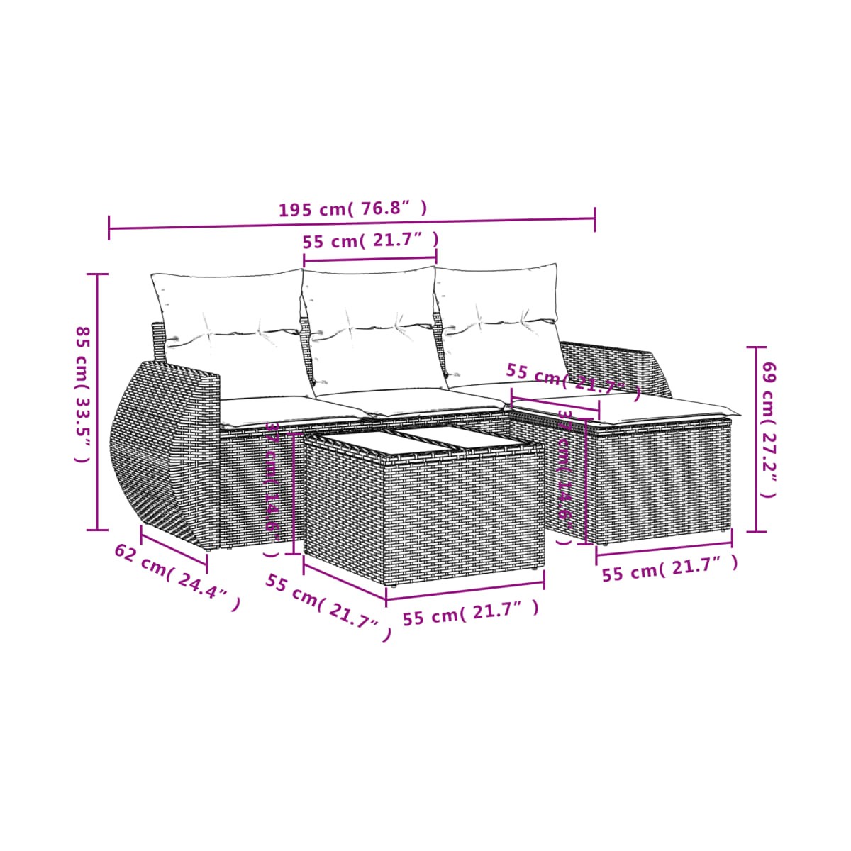 - Dimensiones del cojín de asiento: 55 x 55 x 3 cm (ancho x profundo x grosor)