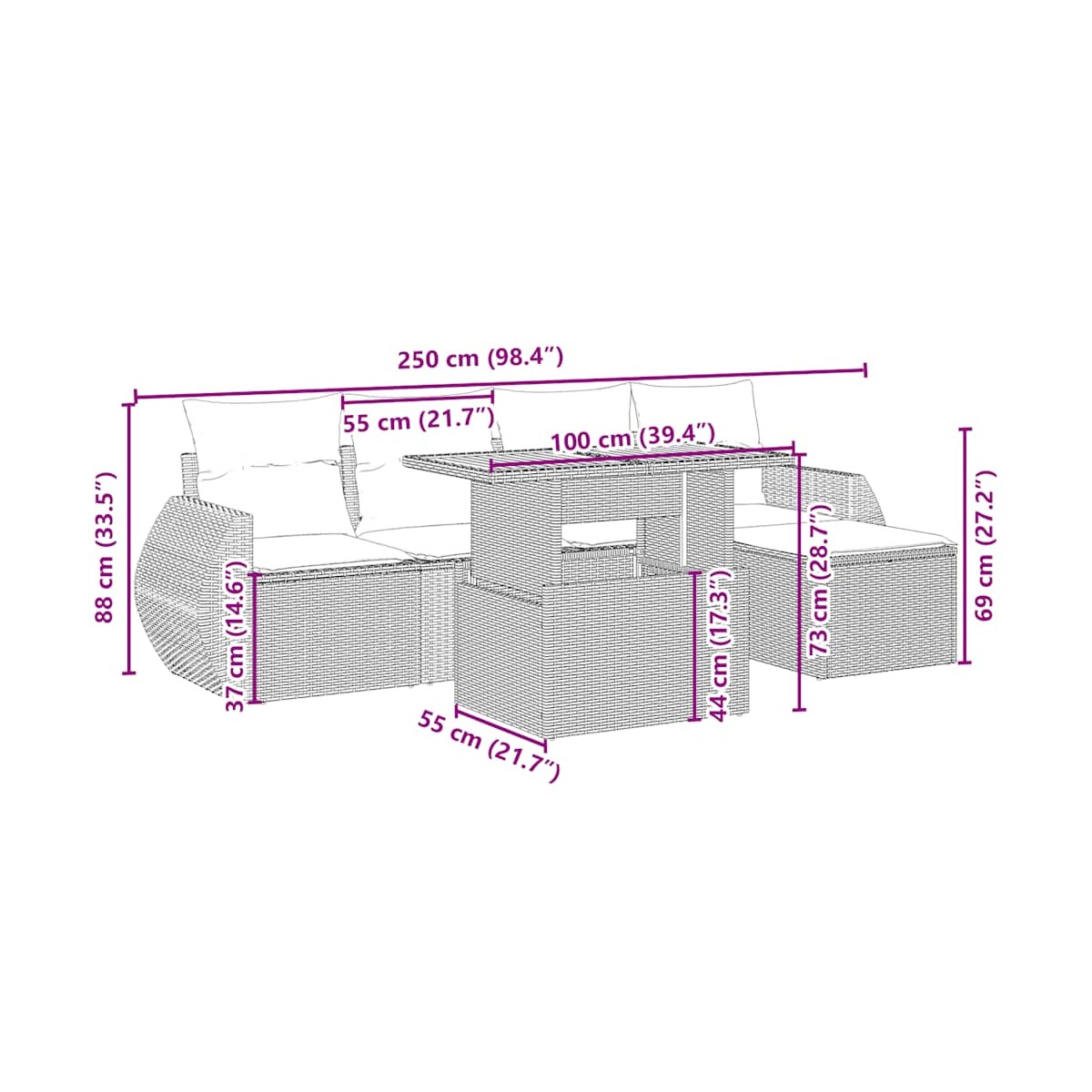 Este conjunto de sofás de jardín es el complemento perfecto para el jardín, terraza o patio, ya que proporciona un espacio confortable y acogedor para charlar con familiares y amigos o simplemente relajarte y disfrutar del aire libre. Material duradero: El ratán PE, también conocido como ratán sintético, es un material sintético resistente y de bajo mantenimiento que se parece al ratán natural. Es ligero, fácil de limpiar y se usa comúnmente para muebles de exterior debido a su durabilidad y propiedades resistentes a la intemperie.Tablero ajustable: El tablero de la mesa se puede levantar para que la mesa sea más alta, lo que transforma la mesa de jardín de una mesa de centro a una mesa de comedor. Es perfecta para invitar a invitados o comer al aire libre.Funda desenfundable y lavable: Estos cojines de asiento cuentan con fundas desenfundables para facilitar el lavado y mantenimiento.Diseño modular: Este conjunto de muebles de exterior tiene un diseño modular, por lo que es completamente flexible y fácil de mover, para que puedas crear una disposición de muebles de exterior personalizada. Información útil:Para asegurarte de que tus muebles de exterior se mantengan hermosos, recomendamos protegerlos con una funda impermeable.