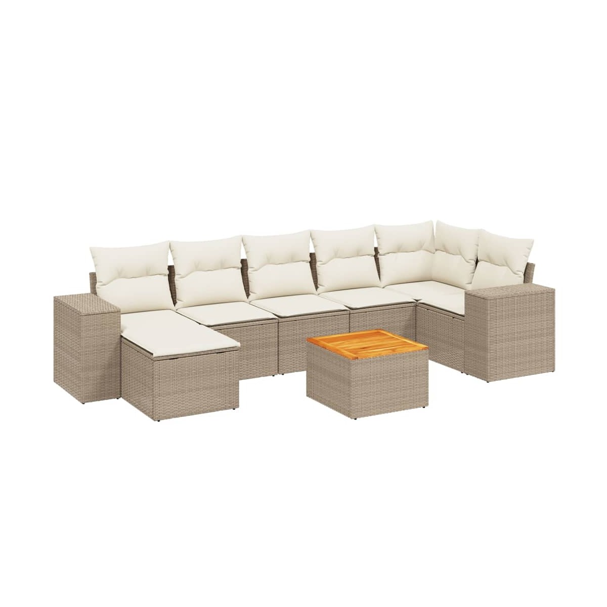 Este conjunto de sofás de jardín es el complemento perfecto para el jardín, terraza o patio, ya que proporciona un espacio confortable y acogedor para charlar con familiares y amigos o simplemente relajarte y disfrutar del aire libre. Material duradero: El ratán PE, también conocido como ratán sintético, es un material sintético resistente y de bajo mantenimiento que se parece al ratán natural. Es ligero, fácil de limpiar y se usa comúnmente para muebles de exterior debido a su durabilidad y propiedades resistentes a la intemperie.Superficie estable y fácil de limpiar: Esta mesa de jardín tiene una superficie de madera de acacia que es resistente, duradero y fácil de limpiar con un paño húmedo. Función de almacenaje con bolsa impermeable: Cada asiento de jardín cuenta con espacio de almacenamiento debajo del asiento, completo con una bolsa resistente al agua para guardar cojines, juguetes y otros artículos. Las bolsas interiores tienen una cubierta superior y pueden fijarse firmemente a los asientos con cierres adhesivos para mayor estabilidad.Experiencia de asiento cómoda: Estos muebles de exterior, completos con cojines acolchados gruesos, ofrecen una experiencia de asiento cómoda.Diseño modular: Este conjunto de muebles de exterior tiene un diseño modular, por lo que es completamente flexible y fácil de mover, para que puedas crear una disposición de muebles de exterior personalizada. Información útil:Para asegurarte de que tus muebles de exterior se mantengan hermosos, recomendamos protegerlos con una funda impermeable.
