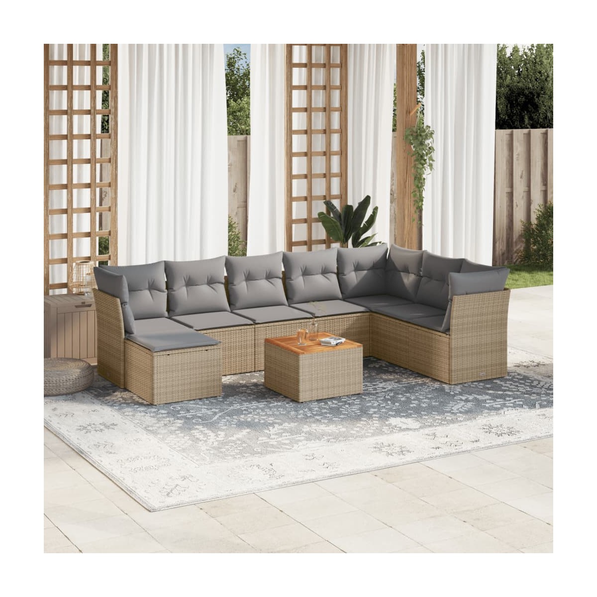 Este conjunto de sofás de jardín es el complemento perfecto para el jardín, terraza o patio, ya que proporciona un espacio confortable y acogedor para charlar con familiares y amigos o simplemente relajarte y disfrutar del aire libre. Material duradero: El ratán PE, también conocido como ratán sintético, es un material sintético resistente y de bajo mantenimiento que se parece al ratán natural. Es ligero, fácil de limpiar y se usa comúnmente para muebles de exterior debido a su durabilidad y propiedades resistentes a la intemperie.Experiencia de asiento cómoda: Estos muebles de exterior, completos con cojines acolchados gruesos, ofrecen una experiencia de asiento cómoda.Superficie estable y fácil de limpiar: Esta mesa de jardín tiene una superficie de madera de acacia que es resistente, duradero y fácil de limpiar con un paño húmedo.Funda desenfundable y lavable: Estos cojines de asiento cuentan con fundas desenfundables para facilitar el lavado y mantenimiento.Diseño modular: Este conjunto de muebles de exterior tiene un diseño modular, por lo que es completamente flexible y fácil de mover, para que puedas crear una disposición de muebles de exterior personalizada. Información útil:Para asegurarte de que tus muebles de exterior se mantengan hermosos, recomendamos protegerlos con una funda impermeable.