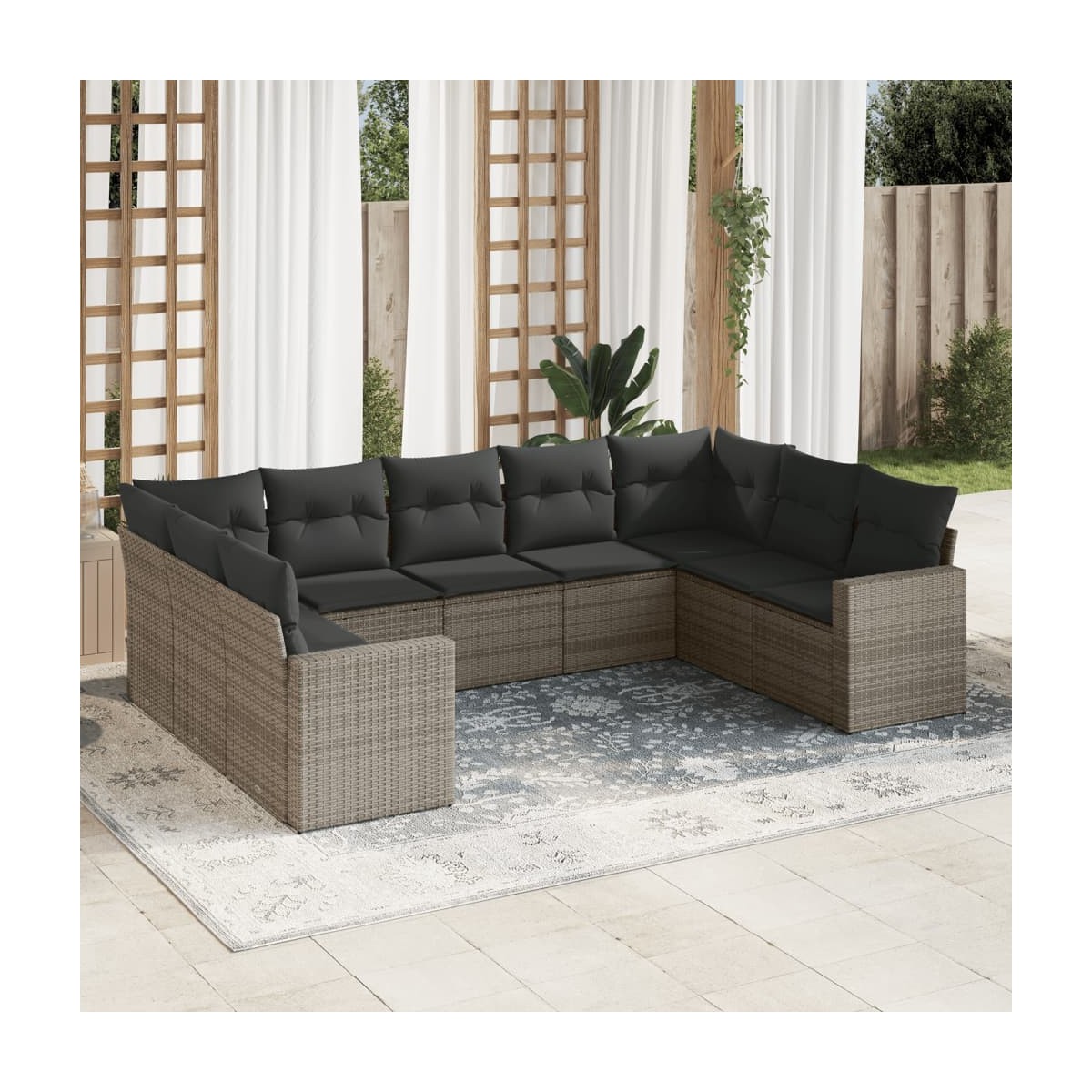 Este conjunto de sofás de jardín es el complemento perfecto para el jardín, terraza o patio, ya que proporciona un espacio confortable y acogedor para charlar con familiares y amigos o simplemente relajarte y disfrutar del aire libre. Material duradero: El ratán de PE, también conocido como ratán sintético, es un material sintético resistente y de bajo mantenimiento que se parece al ratán natural. Es ligero, fácil de limpiar y se usa comúnmente para muebles de exterior debido a su durabilidad y propiedades resistentes a la intemperie.Experiencia de asiento cómoda: Estos muebles de exterior, completos con cojines acolchados gruesos, ofrecen una experiencia de asiento cómoda. Los anchos reposabrazos también ofrecen un lugar práctico para guardar el móvil, tazas u otros objetos pequeños al alcance de la mano.Funda desenfundable y lavable: Estos cojines de asiento cuentan con fundas desenfundables para facilitar el lavado y mantenimiento.Diseño modular: Este conjunto de muebles de exterior tiene un diseño modular, por lo que es completamente flexible y fácil de mover, para que puedas crear una disposición de muebles de exterior personalizada. Información útil:Para asegurarte de que tus muebles de exterior se mantengan hermosos, recomendamos protegerlos con una funda impermeable.