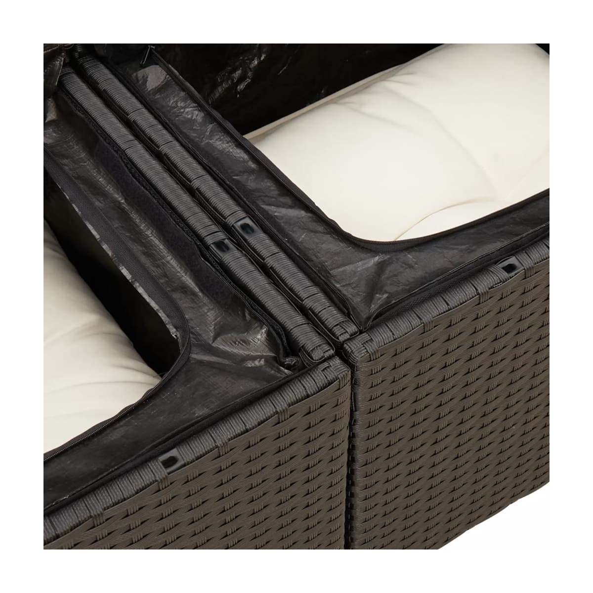 Este conjunto de sofás de jardín es el complemento perfecto para el jardín, terraza o patio, ya que proporciona un espacio confortable y acogedor para charlar con familiares y amigos o simplemente relajarte y disfrutar del aire libre. Material duradero: El ratán PE, también conocido como ratán sintético, es un material sintético resistente y de bajo mantenimiento que se parece al ratán natural. Es ligero, fácil de limpiar y se usa comúnmente para muebles de exterior debido a su durabilidad y propiedades resistentes a la intemperie.Función de almacenaje con bolsa impermeable: Cada asiento de jardín cuenta con espacio de almacenamiento debajo del asiento, completo con una bolsa resistente al agua para guardar cojines, juguetes y otros artículos. Las bolsas interiores tienen una cubierta superior y pueden fijarse firmemente a los asientos con cierres adhesivos para mayor estabilidad.Superficie estable y fácil de limpiar: Esta mesa de jardín tiene una superficie de madera de acacia que es resistente, duradero y fácil de limpiar con un paño húmedo.Funda desenfundable y lavable: Estos cojines de asiento cuentan con fundas desenfundables para facilitar el lavado y mantenimiento.Diseño modular: Este conjunto de muebles de exterior tiene un diseño modular, por lo que es completamente flexible y fácil de mover, para que puedas crear una disposición de muebles de exterior personalizada. Información útil:Para asegurarte de que tus muebles de exterior se mantengan hermosos, recomendamos protegerlos con una funda impermeable.