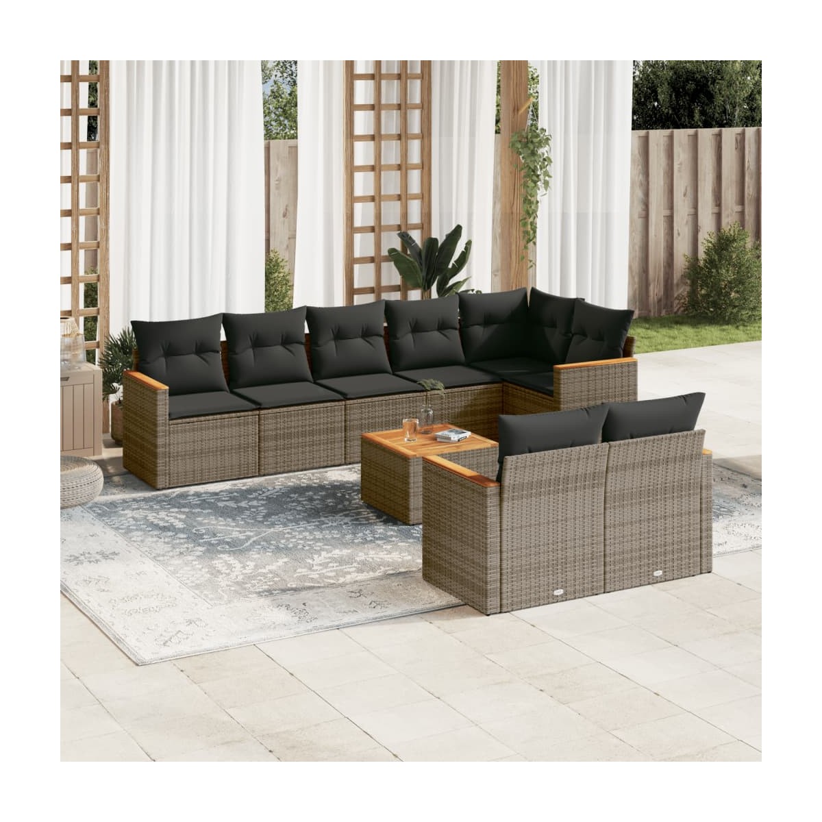 Este conjunto de sofás de jardín es el complemento perfecto para el jardín, terraza o patio, ya que proporciona un espacio confortable y acogedor para charlar con familiares y amigos o simplemente relajarte y disfrutar del aire libre. Material duradero: El ratán PE, también conocido como ratán sintético, es un material sintético resistente y de bajo mantenimiento que se parece al ratán natural. Es ligero, fácil de limpiar y se usa comúnmente para muebles de exterior debido a su durabilidad y propiedades resistentes a la intemperie.Superficie estable y fácil de limpiar: Esta mesa de jardín tiene una superficie de madera de acacia que es resistente, duradero y fácil de limpiar con un paño húmedo.Funda desenfundable y lavable: Estos cojines de asiento cuentan con fundas desenfundables para facilitar el lavado y mantenimiento.Estructura robusta y estable: La estructura de acero con recubrimiento en polvo garantiza que el mueble de jardín sea resistente y estable para usarlo a diario al aire libre.Diseño modular: Este conjunto de muebles de exterior tiene un diseño modular, por lo que es completamente flexible y fácil de mover, para que puedas crear una disposición de muebles de exterior personalizada. Información útil:Para asegurarte de que tus muebles de exterior se mantengan hermosos, recomendamos protegerlos con una funda impermeable.