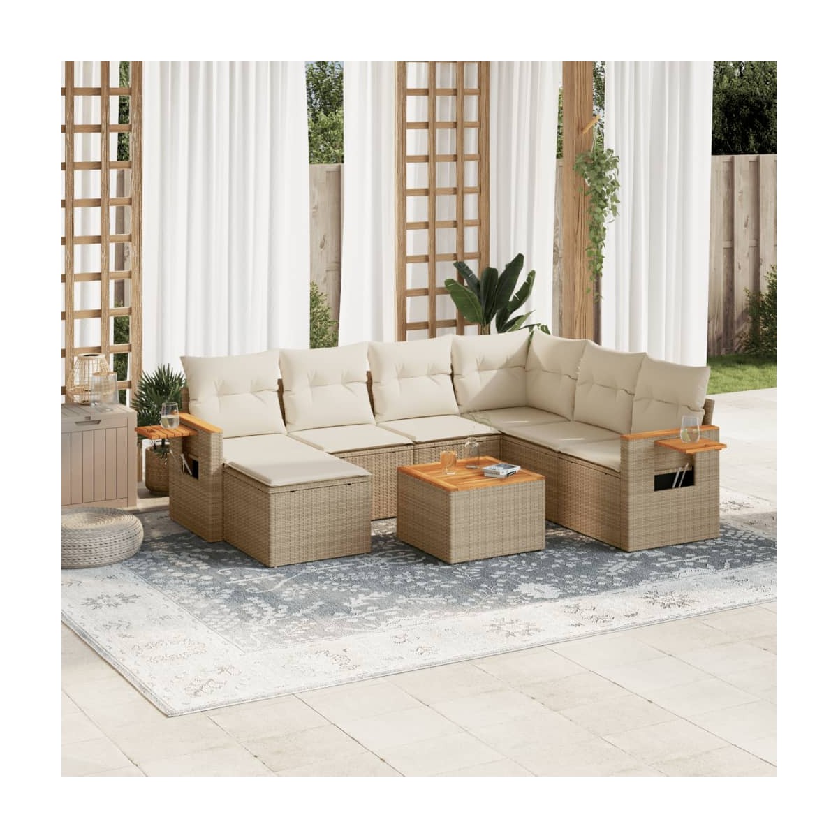 Este conjunto de sofás de jardín es el complemento perfecto para el jardín, terraza o patio, ya que proporciona un espacio confortable y acogedor para charlar con familiares y amigos o simplemente relajarte y disfrutar del aire libre. Material duradero: El ratán PE, también conocido como ratán sintético, es un material sintético resistente y de bajo mantenimiento que se parece al ratán natural. Es ligero, fácil de limpiar y se usa comúnmente para muebles de exterior debido a su durabilidad y propiedades resistentes a la intemperie.Superficie estable y fácil de limpiar: Esta mesa de jardín tiene una superficie de madera de acacia que es resistente, duradero y fácil de limpiar con un paño húmedo.Cómoda mesa auxiliar: Este mueble de exterior cuenta con una mesa auxiliar plegable con un resorte de gas en los reposabrazos, lo que proporciona un lugar conveniente para mantener tus elementos esenciales al alcance de la mano.Funda desenfundable y lavable: Estos cojines de asiento cuentan con fundas desenfundables para facilitar el lavado y mantenimiento.Diseño modular: Este conjunto de muebles de exterior tiene un diseño modular, por lo que es completamente flexible y fácil de mover, para que puedas crear una disposición de muebles de exterior personalizada. Información útil:Para asegurarte de que tus muebles de exterior se mantengan hermosos, recomendamos protegerlos con una funda impermeable.