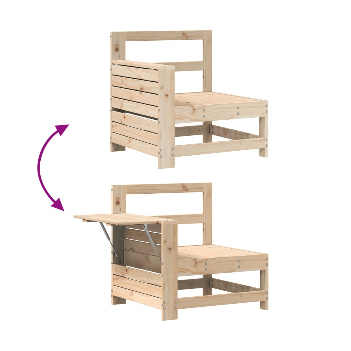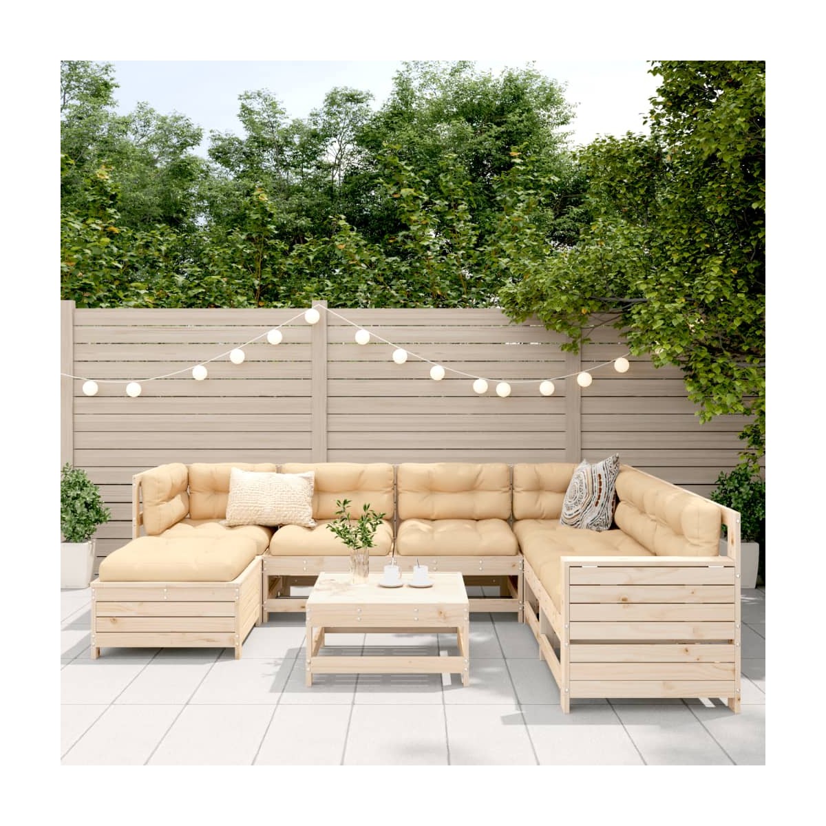Este juego de sofás de jardín de madera, con un diseño de listones, será un gran complemento para el jardín, el patio o la terraza, para poder disfrutar de un rato agradable con la familia o los amigos. Material resistente y duradero: La madera maciza de pino es conocida por su resistencia y durabilidad. Sus vetas rectas y nudos característicos contribuyen a su encanto rústico. Buena ventilación y prevención de encharcamientos: El diseño de rejilla favorece un flujo de aire óptimo y evita eficazmente la acumulación de agua, lo que garantiza un asiento seco y cómodo. Uso versátil: El taburete de jardín no solo se puede usar para sentarse o relajar los pies, sino que también se puede usar como mesa de centro para guardar bebidas, comida y otros adornos. Cómoda mesa auxiliar: Este mueble de exterior cuenta con una mesa auxiliar plegable con un muelle de gas en el reposabrazos, lo que proporciona un lugar práctico para mantener tus elementos esenciales al alcance de la mano. Diseño modular: Este conjunto de muebles de exterior tiene un diseño modular, por lo que es completamente flexible y fácil de mover, para que puedas crear una disposición de muebles de exterior personalizada. Información útil:Para asegurarte de que tus muebles de exterior se mantengan hermosos, recomendamos protegerlos con una funda impermeable.