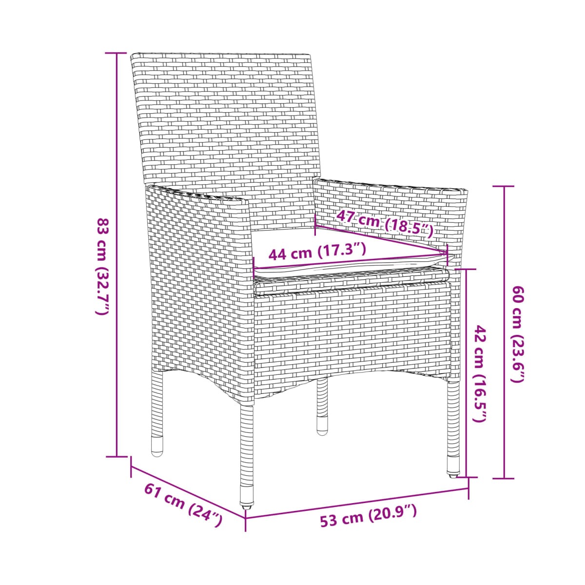- Dimensiones del asiento: 44 x 47 cm (ancho x profundo)