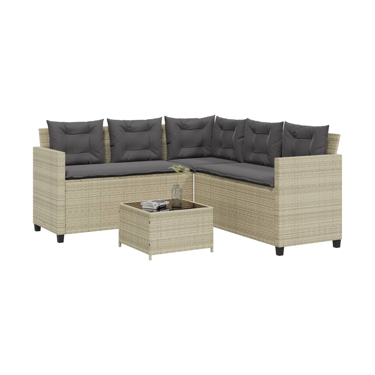 Este sofá de jardín en forma de L es el complemento perfecto para tu jardín, terraza o patio, ya que proporciona un espacio cómodo y acogedor para charlar con familiares y amigos o simplemente relajarse y disfrutar del aire libre. Material duradero: El ratán PE, también conocido como ratán sintético, es un material sintético resistente y de bajo mantenimiento que se parece al ratán natural. Es ligero, fácil de limpiar y se usa comúnmente para muebles de exterior debido a su durabilidad y propiedades resistentes a la intemperie.Experiencia de asiento cómoda: Estos muebles de exterior, completos con cojines acolchados gruesos, ofrecen una experiencia de asiento cómoda.Superficie de vidrio: La superficie de la mesa de exterior es de vidrio templado resistente y duradero, por lo que es fácil de limpiar con un paño húmedo y añade un toque de elegancia a tu espacio exterior.Funda desenfundable y lavable: Estos cojines de asiento cuentan con fundas desenfundables para facilitar el lavado y mantenimiento.Estructura robusta y estable: La estructura de acero con recubrimiento en polvo garantiza que el mueble de jardín sea resistente y estable para usarlo a diario al aire libre. Información útil:Para asegurarte de que tus muebles de exterior se mantengan hermosos, recomendamos protegerlos con una funda impermeable.