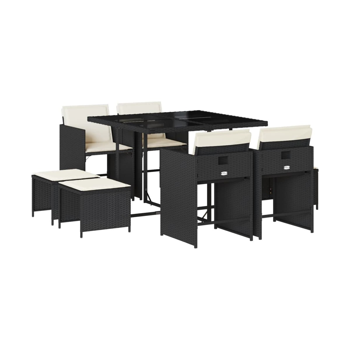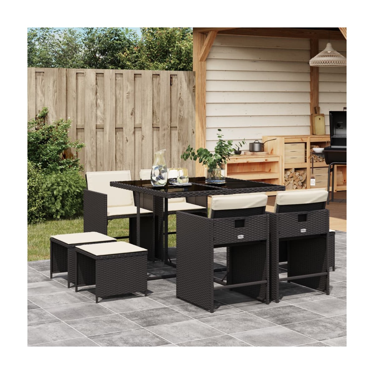 Este juego de comedor de jardín es una gran elección para comer al aire libre o simplemente para relajarte en el jardín, el patio o la terraza. Material duradero: El ratán PE, también conocido como ratán sintético, es un material sintético resistente y de bajo mantenimiento que se parece al ratán natural. Es ligero, fácil de limpiar y se usa comúnmente para muebles de exterior debido a su durabilidad y propiedades resistentes a la intemperie.Almacenamiento compacto: Estas sillas tienen un respaldo con solapa que se puede plegar, lo que facilita guardarlas debajo de la mesa. Cuando están plegadas, caben perfectamente debajo de la mesa, formando un cubo que ahorra espacio. Además, los taburetes también se pueden guardar debajo de las sillas, maximizando aún más la eficiencia del espacio.Experiencia de asiento cómoda: Estos muebles de exterior, completos con cojines acolchados gruesos, ofrecen una experiencia de asiento cómoda.Funda extraíble y lavable: Estos cojines para sillas cuentan con fundas extraíbles para facilitar su lavado y mantenimiento. Las fundas de los cojines de silla tienen una solapa en la parte posterior para facilitar su fijación a las sillas.Superficie estable y fácil de limpiar: Esta mesa de jardín tiene un tablero de vidrio templado que es resistente, duradero y fácil de limpiar con un paño húmedo. Información útil: Para asegurarte de que tus muebles de exterior se mantengan hermosos, recomendamos protegerlos con una funda impermeable.