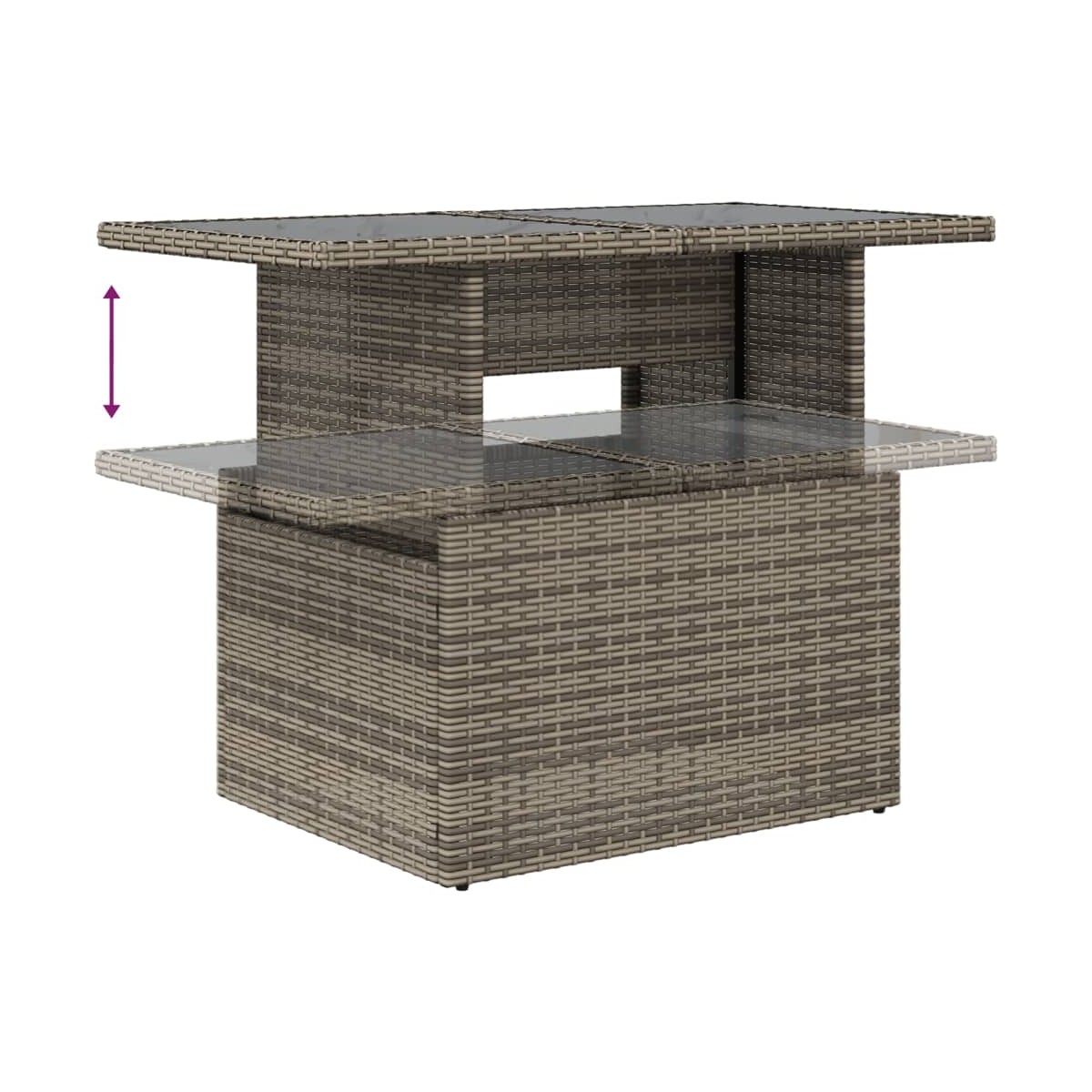 Este conjunto de sofás de jardín es el complemento perfecto para el jardín, terraza o patio, ya que proporciona un espacio confortable y acogedor para charlar con familiares y amigos o simplemente relajarte y disfrutar del aire libre. Material duradero: El ratán PE, también conocido como ratán sintético, es un material sintético resistente y de bajo mantenimiento que se parece al ratán natural. Es ligero, fácil de limpiar y se usa comúnmente para muebles de exterior debido a su durabilidad y propiedades resistentes a la intemperie.Tablero ajustable: El tablero de la mesa se puede levantar para que la mesa sea más alta, lo que transforma la mesa al aire libre de una mesa de café a una mesa de comedor. Es perfecto para invitar a invitados o comer al aire libre.Experiencia de asiento cómoda: Estos muebles de exterior, completos con cojines acolchados gruesos, ofrecen una experiencia de asiento cómoda.Funda desenfundable y lavable: Estos cojines de asiento cuentan con fundas desenfundables para facilitar el lavado y mantenimiento.Diseño modular: Este conjunto de muebles de exterior tiene un diseño modular, por lo que es completamente flexible y fácil de mover, para que puedas crear una disposición de muebles de exterior personalizada. Información útil:Para asegurarte de que tus muebles de exterior se mantengan hermosos, recomendamos protegerlos con una funda impermeable.