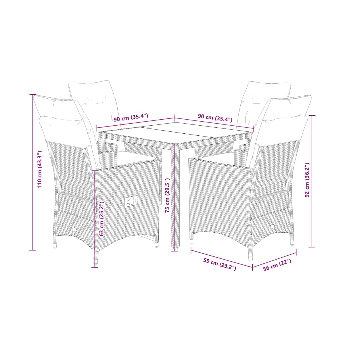 Este juego de comedor de jardín es una gran elección para comer al aire libre o simplemente para relajarte en el jardín, el patio o la terraza. Material duradero: El ratán PE, también conocido como ratán sintético, es un material sintético resistente y de bajo mantenimiento que se parece al ratán natural. Es ligero, fácil de limpiar y se usa comúnmente para muebles de exterior debido a su durabilidad y propiedades resistentes a la intemperie.Respaldo y reposapiés ajustables: este asiento de jardín tiene un asa. Puedes ajustar el respaldo y el reposapiés a cualquier posición tirando del asa y devolverlos rápidamente a sus posiciones originales.Superficie estable y fácil de limpiar: Esta mesa de jardín tiene una superficie de madera de acacia que es resistente, duradero y fácil de limpiar con un paño húmedo.Experiencia de asiento cómoda: Este juego de muebles de exterior, completo con cojines acolchados gruesos, ofrece una experiencia de asiento cómoda.Funda desenfundable y lavable: Estos cojines de asiento cuentan con fundas desenfundables para facilitar el lavado y mantenimiento. Los cojines del respaldo tienen una solapa en la parte posterior para facilitar la fijación a los respaldos. Información útil:Para asegurarte de que tus muebles de exterior se mantengan hermosos, recomendamos protegerlos con una funda impermeable.