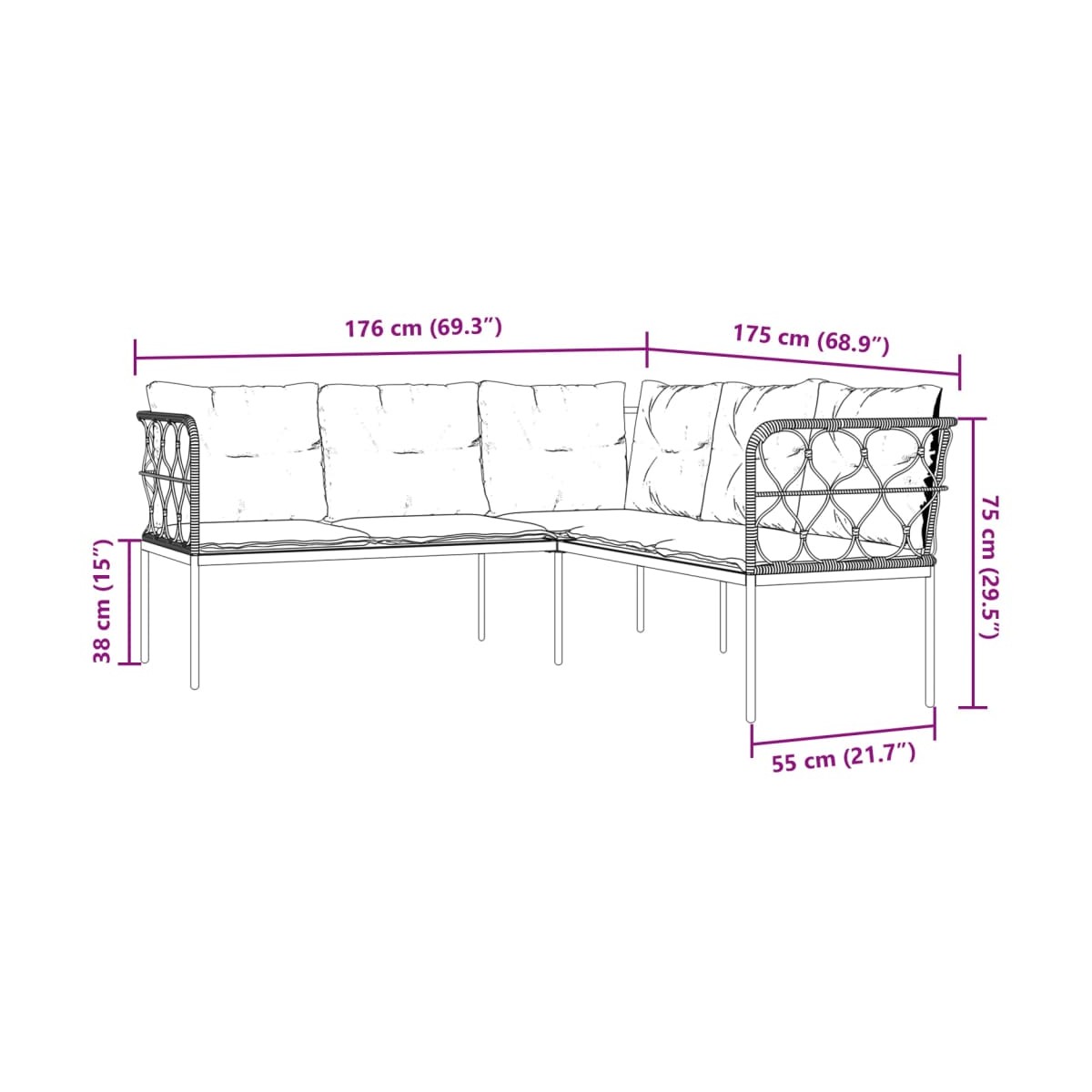 - Dimensiones: 176 x 175 x 75 cm (ancho x profundo x alto)