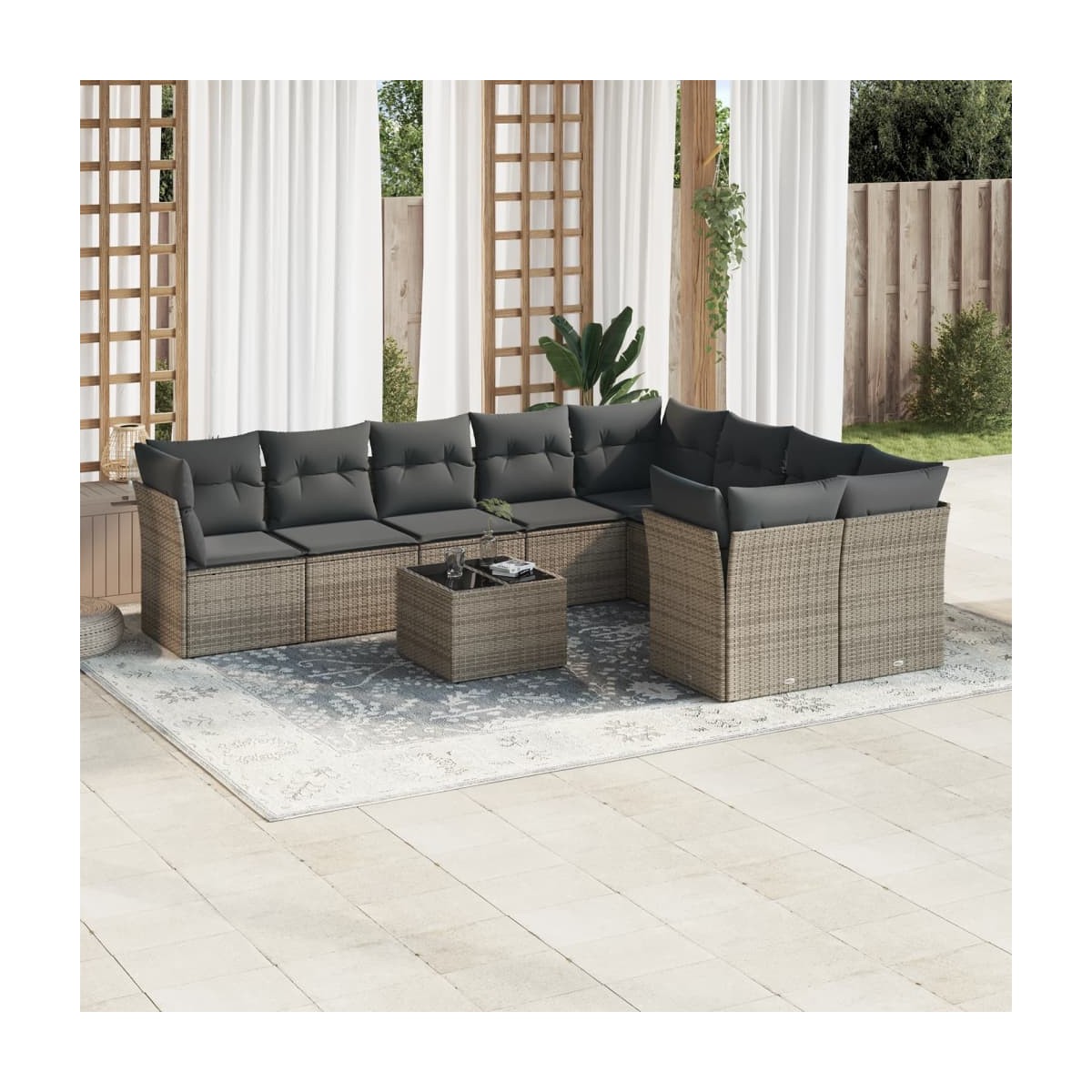 Este conjunto de sofás de jardín es el complemento perfecto para el jardín, terraza o patio, ya que proporciona un espacio confortable y acogedor para charlar con familiares y amigos o simplemente relajarte y disfrutar del aire libre. Material duradero: El ratán de PE, también conocido como ratán sintético, es un material sintético resistente y de bajo mantenimiento que se parece al ratán natural. Es ligero, fácil de limpiar y se usa comúnmente para muebles de exterior debido a su durabilidad y propiedades resistentes a la intemperie.Experiencia de asiento cómoda: Estos muebles de exterior, completos con cojines acolchados gruesos, ofrecen una experiencia de asiento cómoda.Superficie de vidrio: La superficie de la mesa de exterior es de vidrio templado resistente y duradero, por lo que es fácil de limpiar con un paño húmedo y añade un toque de elegancia a tu espacio exterior.Funda desenfundable y lavable: Estos cojines de asiento cuentan con fundas desenfundables para facilitar el lavado y mantenimiento.Diseño modular: Este conjunto de muebles de exterior tiene un diseño modular, por lo que es completamente flexible y fácil de mover, para que puedas crear una disposición de muebles de exterior personalizada. Información útil:Para asegurarte de que tus muebles de exterior se mantengan hermosos, recomendamos protegerlos con una funda impermeable.