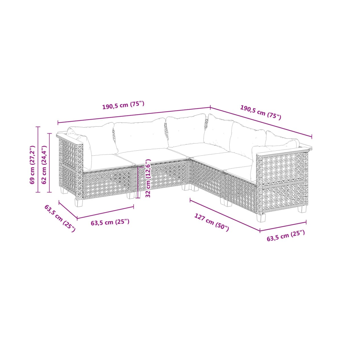 - Dimensiones del cojín del asiento (esquina): 56,5 x 56,5 x 3 cm (ancho x profundo x grosor)
