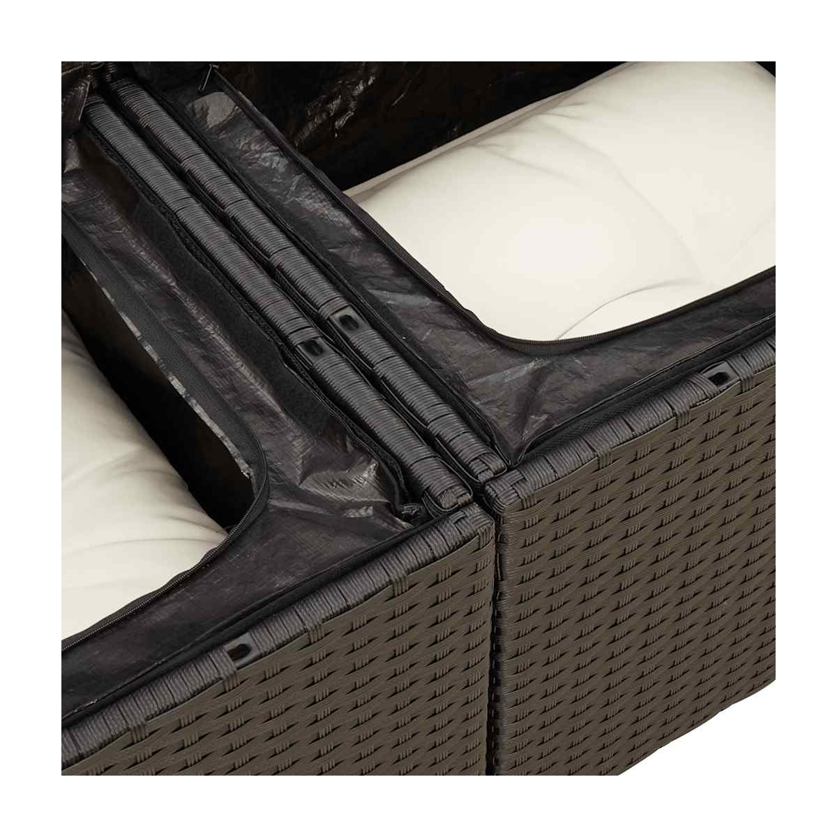 Este conjunto de sofás de jardín es el complemento perfecto para el jardín, terraza o patio, ya que proporciona un espacio confortable y acogedor para charlar con familiares y amigos o simplemente relajarte y disfrutar del aire libre. Material duradero: El ratán sintético, también conocido como ratán sintético, es un material sintético resistente y de bajo mantenimiento que se parece al ratán natural. Es ligero, fácil de limpiar y se usa comúnmente para muebles de exterior debido a su durabilidad y propiedades resistentes a la intemperie.Función de almacenamiento con bolsa resistente al agua: Cada asiento de jardín cuenta con un espacio de almacenamiento debajo del asiento, completo con una bolsa resistente al agua para guardar cojines, juguetes y otros artículos. La bolsa interior tiene una cubierta superior y se puede sujetar de forma segura al asiento con cierres de gancho y bucle para mayor estabilidad.Reposapiés versátil: El taburete es versátil y sirve como un cómodo reposapiés para cuando descanses en el sofá o como asiento adicional en tu jardín.Funda desenfundable y lavable: Estos cojines de asiento cuentan con fundas desenfundables para facilitar el lavado y mantenimiento.Estructura robusta y estable: La estructura de acero con recubrimiento en polvo es fuerte, estable, duradero y resistente a la corrosión y a las inclemencias del tiempo, lo que garantiza un rendimiento duradero. Información útil:Para asegurarte de que tus muebles de exterior se mantengan hermosos, recomendamos protegerlos con una funda impermeable.