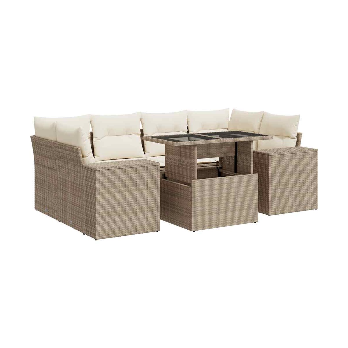 Este conjunto de sofás de jardín es el complemento perfecto para el jardín, terraza o patio, ya que proporciona un espacio confortable y acogedor para charlar con familiares y amigos o simplemente relajarte y disfrutar del aire libre. Material duradero: El ratán sintético, también conocido como ratán sintético, es un material sintético resistente y de bajo mantenimiento que se parece al ratán natural. Es ligero, fácil de limpiar y se usa comúnmente para muebles de exterior debido a su durabilidad y propiedades resistentes a la intemperie.Función de almacenamiento con bolsa resistente al agua: El mueble de jardín cuenta con espacio de almacenamiento debajo del asiento, completo con una bolsa resistente al agua para guardar cojines, juguetes y otros artículos. La bolsa interior se puede sujetar de forma segura a los muebles de exterior con cierres de gancho y bucle para mayor estabilidad.Tablero ajustable: El tablero de la mesa se puede levantar para que la mesa sea más alta, lo que transforma la mesa al aire libre de una mesa de café a una mesa de comedor. Es perfecto para invitar a invitados o comer al aire libre.Funda desenfundable y lavable: Estos cojines de asiento cuentan con fundas desenfundables para facilitar el lavado y mantenimiento.Diseño modular: Este conjunto de muebles de exterior tiene un diseño modular, por lo que es completamente flexible y fácil de mover, para que puedas crear una disposición de muebles de exterior personalizada. Información útil:Para asegurarte de que tus muebles de exterior se mantengan hermosos, recomendamos protegerlos con una funda impermeable.