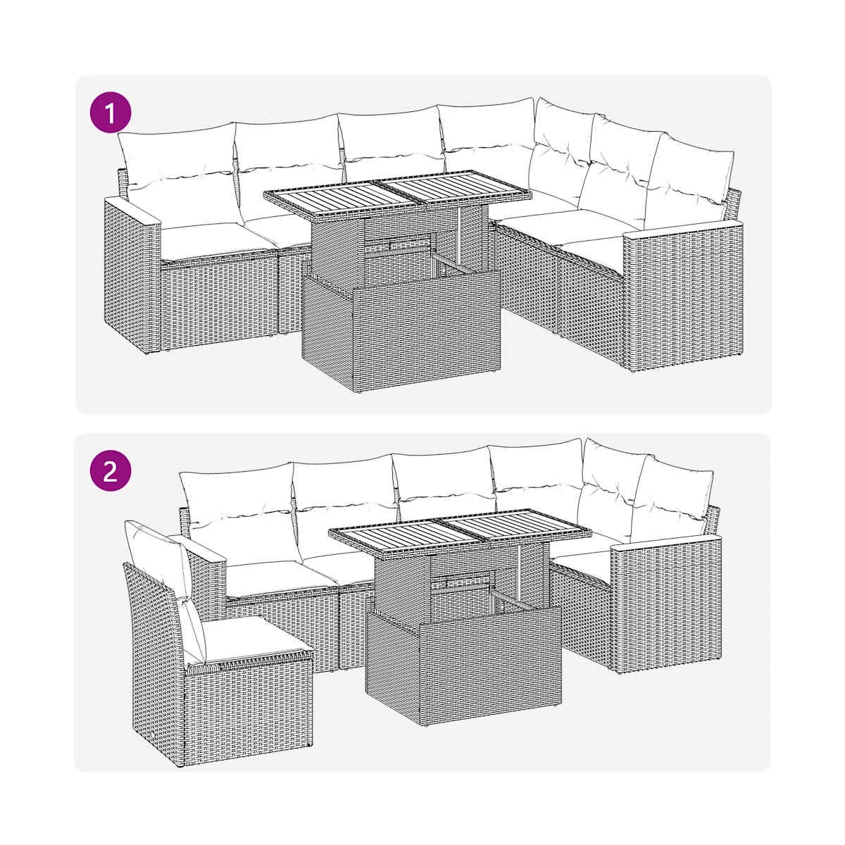 Este conjunto de sofás de jardín es el complemento perfecto para el jardín, terraza o patio, ya que proporciona un espacio confortable y acogedor para charlar con familiares y amigos o simplemente relajarte y disfrutar del aire libre.Material duradero: El ratán sintético, también conocido como ratán sintético, es un material sintético resistente y de bajo mantenimiento que se parece al ratán natural. Es ligero, fácil de limpiar y se usa comúnmente para muebles de exterior debido a su durabilidad y propiedades resistentes a la intemperie.Función de almacenamiento con bolsa resistente al agua: Cada asiento de jardín cuenta con un espacio de almacenamiento debajo del asiento, completo con una bolsa resistente al agua para guardar cojines, juguetes y otros artículos. Las bolsas interiores tienen una cubierta superior y se pueden sujetar de forma segura a los asientos con cierres de gancho y bucle para mayor estabilidad.Funda desenfundable y lavable: Estos cojines de asiento cuentan con fundas desenfundables para facilitar el lavado y mantenimiento.Diseño modular: Este conjunto de muebles de exterior tiene un diseño modular, por lo que es completamente flexible y fácil de mover, para que puedas crear una disposición de muebles de exterior personalizada.Información útil:Para asegurarte de que tus muebles de exterior se mantengan hermosos, recomendamos protegerlos con una funda impermeable.