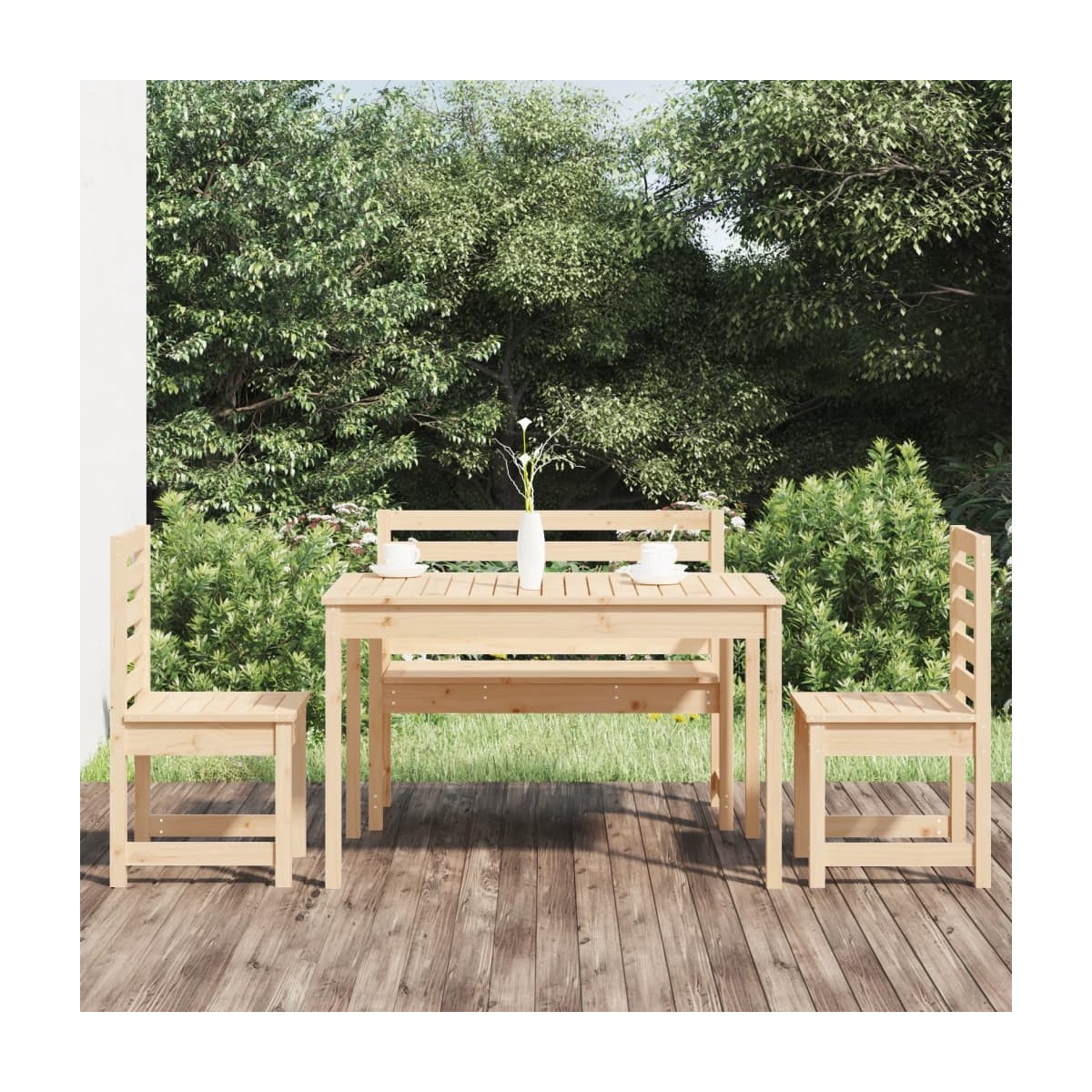 Este clásico juego de comedor para jardín de madera es perfecto para exteriores y está diseñado para ser el centro de atención del jardín, la terraza o el patio, etc. Madera maciza de pino: Este juego de comedor está hecho de madera maciza de pino. La madera maciza de pino es un bonito material natural. La madera de pino tiene vetas rectas, y los nudos dan al material su distintivo aspecto rústico.Práctica superficie: Esta mesa de comedor te proporciona una superficie resistente. Puedes colocar tus aperitivos, bebidas y cualquiera de tus adornos favoritos.Cómodo asiento: El respaldo y el asiento de listones de la silla de jardín ofrecen un gran soporte.Amplios usos: El juego de comedor para exterior, con un diseño sencillo y atemporal, es adecuada para balcones, jardines, patios, etc. Nota:Para asegurarte de que tus muebles de exterior se mantengan hermosos, recomendamos protegerlos con una funda impermeable.