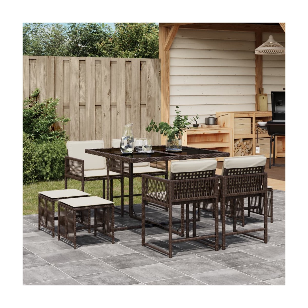 Este juego de comedor de jardín es una gran elección para comer al aire libre o simplemente para relajarte en el jardín, el patio o la terraza. Material duradero: El ratán de PE, también conocido como ratán sintético, es un material sintético resistente y de bajo mantenimiento que se parece al ratán natural. Es ligero, fácil de limpiar y se usa comúnmente para muebles de exterior debido a su durabilidad y propiedades resistentes a la intemperie.Almacenamiento compacto: Estas sillas tienen un respaldo con solapa que se puede plegar, lo que facilita guardarlas debajo de la mesa. Cuando están plegadas, caben perfectamente debajo de la mesa, formando un cubo que ahorra espacio. Además, los taburetes también se pueden guardar debajo de las sillas, maximizando aún más la eficiencia del espacio.Experiencia de asiento cómoda: Estos muebles de exterior, completos con cojines acolchados gruesos, ofrecen una experiencia de asiento cómoda.Funda extraíble y lavable: Estos cojines de asiento cuentan con fundas desenfundables para facilitar el lavado y mantenimiento. Las fundas de los cojines poseen una solapa trasera que permite adherirlas fácilmente a los respaldos.Superficie de vidrio: La superficie de la mesa de exterior es de vidrio templado resistente y duradero, por lo que es fácil de limpiar con un paño húmedo y añade un toque de elegancia a tu espacio exterior. Información útil:Para asegurarte de que tus muebles de exterior se mantengan hermosos, recomendamos protegerlos con una funda impermeable.