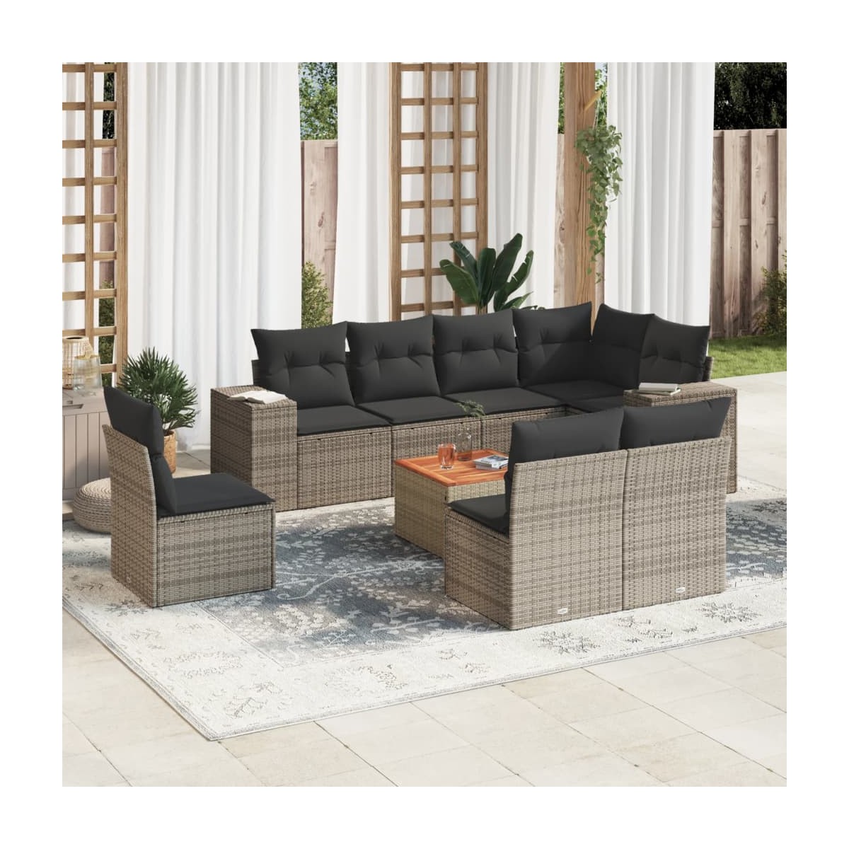 Este conjunto de sofás de jardín es el complemento perfecto para el jardín, terraza o patio, ya que proporciona un espacio confortable y acogedor para charlar con familiares y amigos o simplemente relajarte y disfrutar del aire libre. Material duradero: El ratán de PE, también conocido como ratán sintético, es un material sintético resistente y de bajo mantenimiento que se parece al ratán natural. Es ligero, fácil de limpiar y se usa comúnmente para muebles de exterior debido a su durabilidad y propiedades resistentes a la intemperie. Función de almacenaje con bolsa impermeable: Cada asiento de jardín cuenta con espacio de almacenamiento debajo del asiento, completo con una bolsa resistente al agua para guardar cojines, juguetes y otros artículos. Las bolsas interiores tienen una cubierta superior y pueden fijarse firmemente a los asientos con cierres adhesivos para mayor estabilidad. Superficie estable y fácil de limpiar: Esta mesa de jardín tiene una superficie de madera de acacia que es resistente, duradero y fácil de limpiar con un paño húmedo. Experiencia de asiento cómoda: Estos muebles de exterior, completos con cojines acolchados gruesos, ofrecen una experiencia de asiento cómoda. Diseño modular: Este conjunto de muebles de exterior tiene un diseño modular, por lo que es completamente flexible y fácil de mover, para que puedas crear una disposición de muebles de exterior personalizada. Información útil:Para asegurarte de que tus muebles de exterior se mantengan hermosos, recomendamos protegerlos con una funda impermeable.