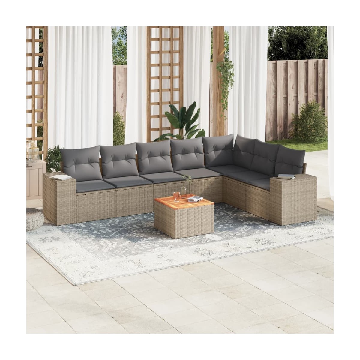 Este conjunto de sofás de jardín es el complemento perfecto para el jardín, terraza o patio, ya que proporciona un espacio confortable y acogedor para charlar con familiares y amigos o simplemente relajarte y disfrutar del aire libre. Material duradero: El ratán de PE, también conocido como ratán sintético, es un material sintético resistente y de bajo mantenimiento que se parece al ratán natural. Es ligero, fácil de limpiar y se usa comúnmente para muebles de exterior debido a su durabilidad y propiedades resistentes a la intemperie.Superficie estable y fácil de limpiar: Esta mesa de jardín tiene una superficie de madera de acacia que es resistente, duradero y fácil de limpiar con un paño húmedo. Experiencia de asiento cómoda: Estos muebles de exterior, completos con cojines acolchados gruesos, ofrecen una experiencia de asiento cómoda. Funda desenfundable y lavable: Estos cojines de asiento cuentan con fundas desenfundables para facilitar el lavado y mantenimiento.Diseño modular: Este conjunto de muebles de exterior tiene un diseño modular, por lo que es completamente flexible y fácil de mover, para que puedas crear una disposición de muebles de exterior personalizada. Información útil:Para asegurarte de que tus muebles de exterior se mantengan hermosos, recomendamos protegerlos con una funda impermeable.