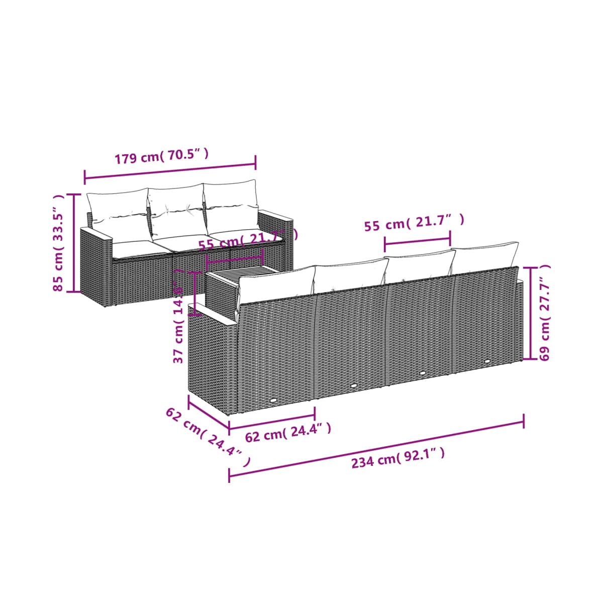 Este conjunto de sofás de jardín es el complemento perfecto para el jardín, terraza o patio, ya que proporciona un espacio confortable y acogedor para charlar con familiares y amigos o simplemente relajarte y disfrutar del aire libre. Material duradero: El ratán PE, también conocido como ratán sintético, es un material sintético resistente y de bajo mantenimiento que se parece al ratán natural. Es ligero, fácil de limpiar y se usa comúnmente para muebles de exterior debido a su durabilidad y propiedades resistentes a la intemperie.Superficie estable y fácil de limpiar: Esta mesa de jardín tiene una superficie de madera de acacia que es resistente, duradero y fácil de limpiar con un paño húmedo.Funda desenfundable y lavable: Estos cojines de asiento cuentan con fundas desenfundables para facilitar el lavado y mantenimiento.Estructura robusta y estable: La estructura de acero con recubrimiento en polvo garantiza que el mueble de jardín sea resistente y estable para usarlo a diario al aire libre.Diseño modular: Este conjunto de muebles de exterior tiene un diseño modular, por lo que es completamente flexible y fácil de mover, para que puedas crear una disposición de muebles de exterior personalizada. Información útil:Para asegurarte de que tus muebles de exterior se mantengan hermosos, recomendamos protegerlos con una funda impermeable.