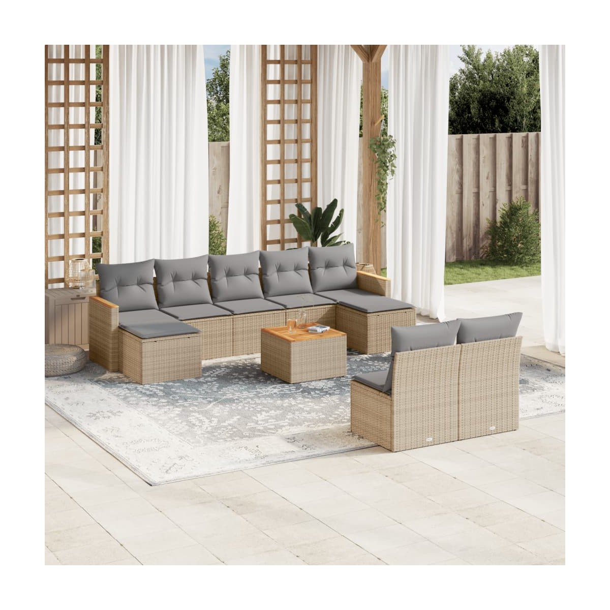 Este conjunto de sofás de jardín es el complemento perfecto para el jardín, terraza o patio, ya que proporciona un espacio confortable y acogedor para charlar con familiares y amigos o simplemente relajarte y disfrutar del aire libre. Material duradero: El ratán PE, también conocido como ratán sintético, es un material sintético resistente y de bajo mantenimiento que se parece al ratán natural. Es ligero, fácil de limpiar y se usa comúnmente para muebles de exterior debido a su durabilidad y propiedades resistentes a la intemperie.Superficie estable y fácil de limpiar: Esta mesa de jardín tiene una superficie de madera de acacia que es resistente, duradero y fácil de limpiar con un paño húmedo.Funda desenfundable y lavable: Estos cojines de asiento cuentan con fundas desenfundables para facilitar el lavado y mantenimiento.Estructura robusta y estable: La estructura de acero con recubrimiento en polvo garantiza que el mueble de jardín sea resistente y estable para usarlo a diario al aire libre.Diseño modular: Este conjunto de muebles de exterior tiene un diseño modular, por lo que es completamente flexible y fácil de mover, para que puedas crear una disposición de muebles de exterior personalizada. Información útil:Para asegurarte de que tus muebles de exterior se mantengan hermosos, recomendamos protegerlos con una funda impermeable.