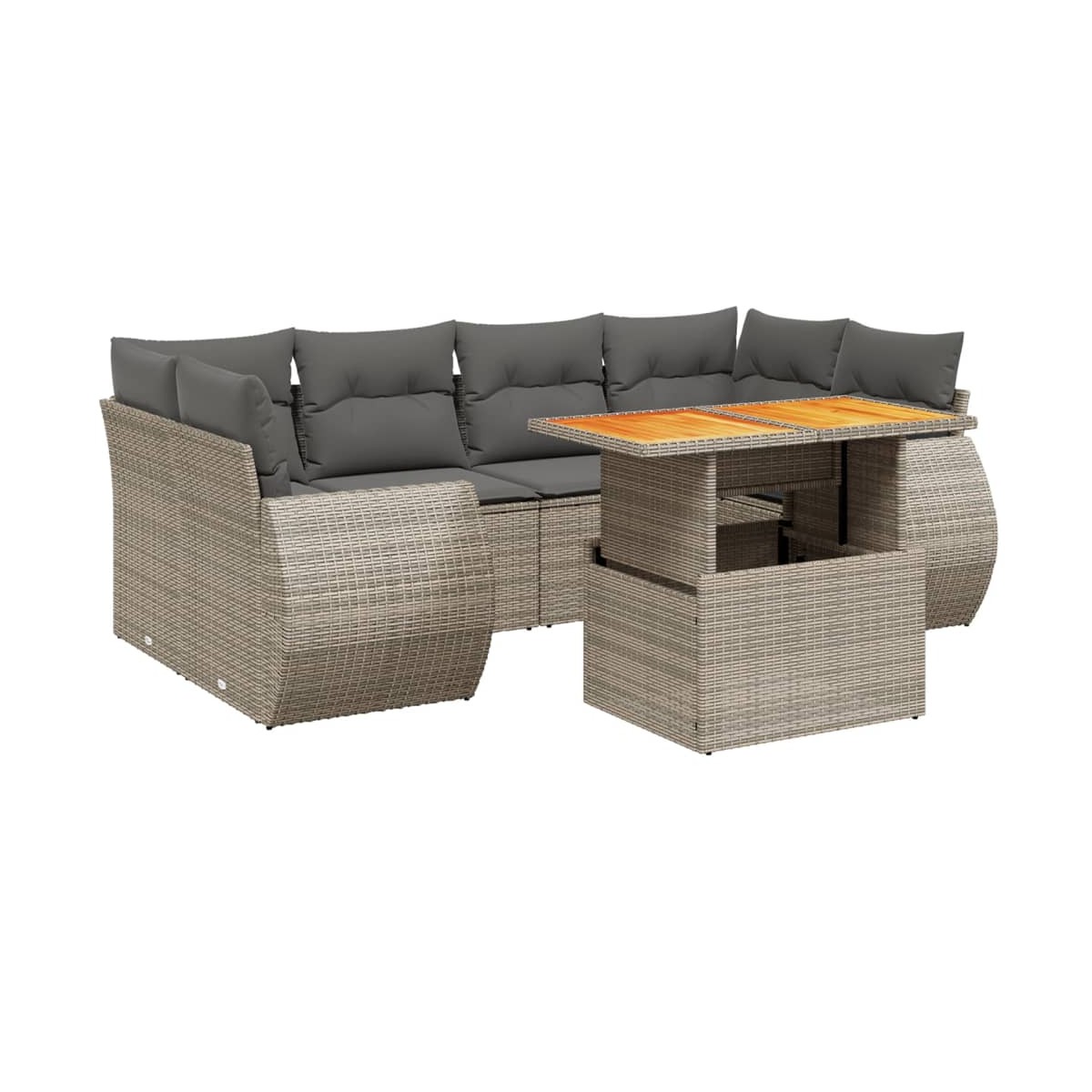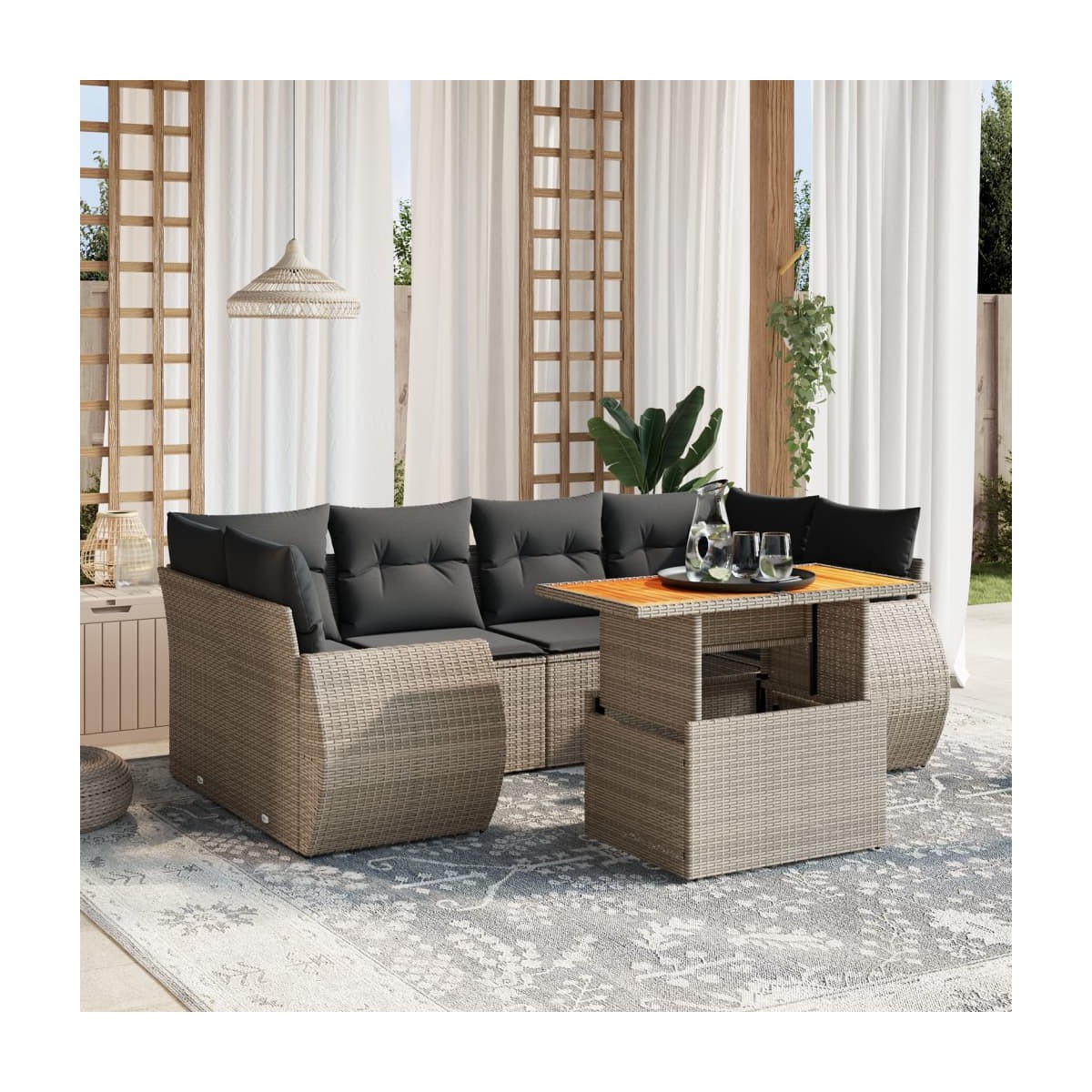 Este conjunto de sofás de jardín es el complemento perfecto para el jardín, terraza o patio, ya que proporciona un espacio confortable y acogedor para charlar con familiares y amigos o simplemente relajarte y disfrutar del aire libre. Material duradero: El ratán PE, también conocido como ratán sintético, es un material sintético resistente y de bajo mantenimiento que se parece al ratán natural. Es ligero, fácil de limpiar y se usa comúnmente para muebles de exterior debido a su durabilidad y propiedades resistentes a la intemperie.Tablero ajustable: El tablero de la mesa se puede levantar para que la mesa sea más alta, lo que transforma la mesa de jardín de una mesa de centro a una mesa de comedor. Es perfecta para invitar a invitados o comer al aire libre.Experiencia de asiento cómoda: Estos muebles de exterior, completos con cojines acolchados gruesos, ofrecen una experiencia de asiento cómoda.Funda desenfundable y lavable: Estos cojines de asiento cuentan con fundas desenfundables para facilitar el lavado y mantenimiento.Diseño modular: Este conjunto de muebles de exterior tiene un diseño modular, por lo que es completamente flexible y fácil de mover, para que puedas crear una disposición de muebles de exterior personalizada. Información útil:Para asegurarte de que tus muebles de exterior se mantengan hermosos, recomendamos protegerlos con una funda impermeable.