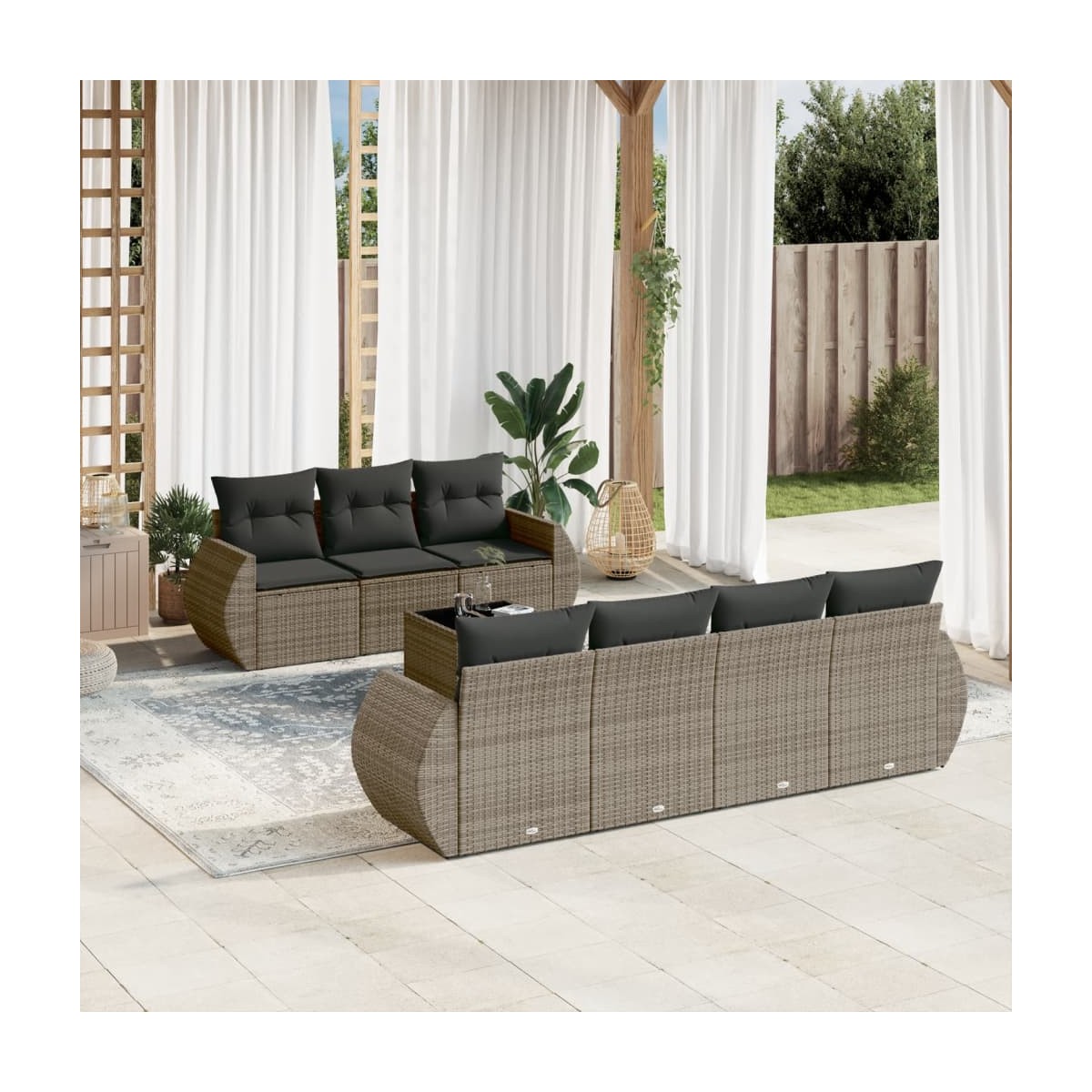 Este conjunto de sofás de jardín es el complemento perfecto para el jardín, terraza o patio, ya que proporciona un espacio confortable y acogedor para charlar con familiares y amigos o simplemente relajarte y disfrutar del aire libre. Material duradero: El ratán PE, también conocido como ratán sintético, es un material sintético resistente y de bajo mantenimiento que se parece al ratán natural. Es ligero, fácil de limpiar y se usa comúnmente para muebles de exterior debido a su durabilidad y propiedades resistentes a la intemperie.Función de almacenaje con bolsa impermeable: Cada asiento de jardín cuenta con espacio de almacenamiento debajo del asiento, completo con una bolsa resistente al agua para guardar cojines, juguetes y otros artículos. Las bolsas interiores tienen una cubierta superior y pueden fijarse firmemente a los asientos con cierres adhesivos para mayor estabilidad.Superficie de vidrio: La superficie de la mesa de exterior es de vidrio templado resistente y duradero, por lo que es fácil de limpiar con un paño húmedo y añade un toque de elegancia a tu espacio exterior.Funda desenfundable y lavable: Estos cojines de asiento cuentan con fundas desenfundables para facilitar el lavado y mantenimiento.Diseño modular: Este conjunto de muebles de exterior tiene un diseño modular, por lo que es completamente flexible y fácil de mover, para que puedas crear una disposición de muebles de exterior personalizada. Información útil:Para asegurarte de que tus muebles de exterior se mantengan hermosos, recomendamos protegerlos con una funda impermeable.