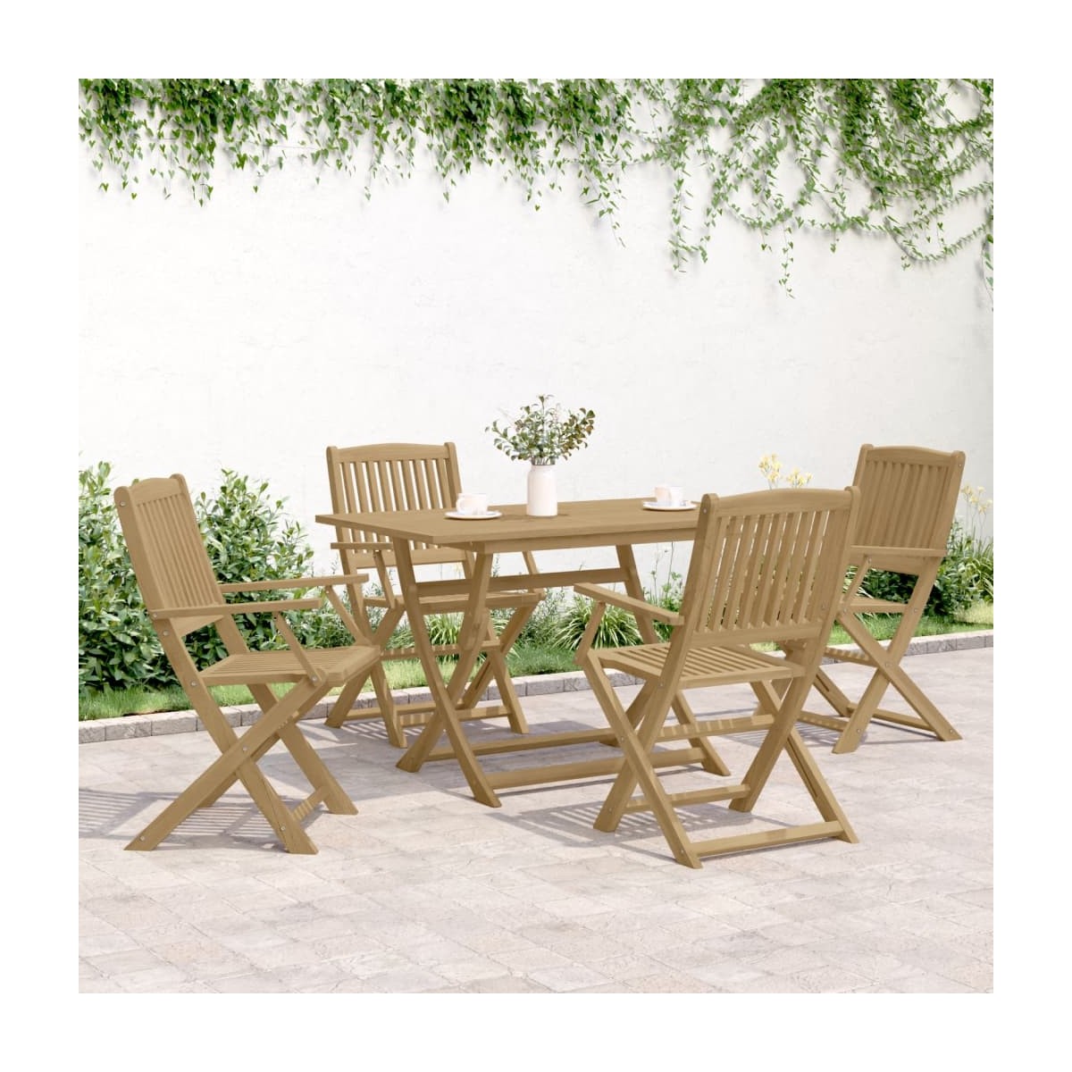 ¡Disfruta de una buena comida o cena en el espacio al aire libre de tu casa con este juego de comedor de madera para jardín! Madera maciza de acacia: El juego de comedor de exterior está hecho de madera maciza de acacia para mayor robustez y estabilidad. La madera maciza de acacia es un bonito material natural. La madera de acacia tiene una veta recta y los nudos le dan al material su estilo rústico característico.Cómoda experiencia de asiento: Con reposabrazos y respaldo, la silla de exterior brinda la máxima comodidad.Diseño de listones: El diseño de listones del juego de comedor de patio evita la acumulación de agua, manteniendo el asiento seco y evitando que se pudra innecesariamente.Superficie estable: La mesa de exterior ofrece un soporte excelente para bebidas, aperitivos, fruteros y tus adornos favoritos.Diseño plegable: La mesa y las sillas de comedor al aire libre se pueden plegar fácilmente cuando no se utilicen y para facilitar su almacenamiento y transporte. Información útil:Para asegurarte de que tus muebles de exterior se mantengan hermosos, recomendamos protegerlos con una funda impermeable.