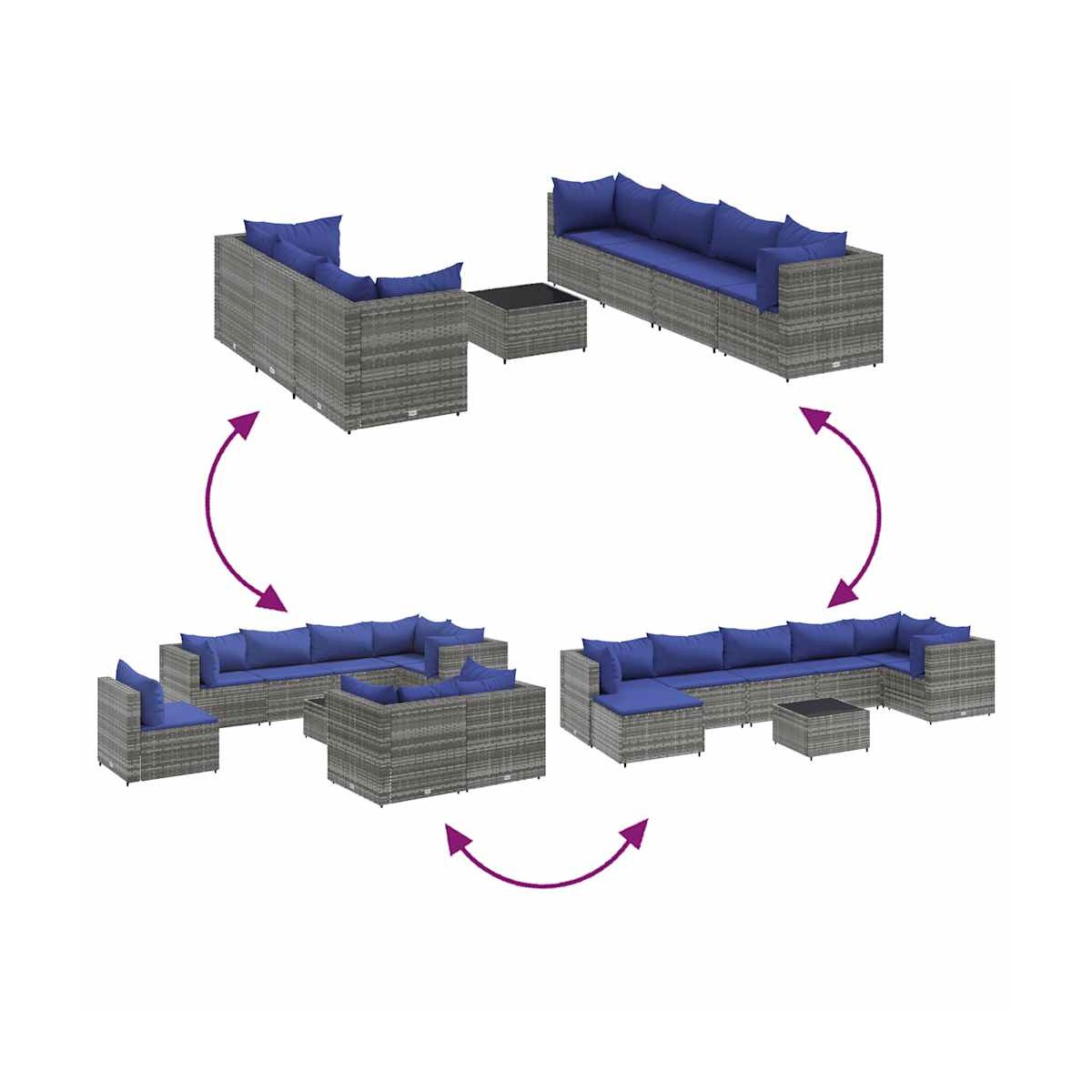 Este conjunto de sofás de jardín es el complemento perfecto para el jardín, terraza o patio, ya que proporciona un espacio confortable y acogedor para charlar con familiares y amigos o simplemente relajarte y disfrutar del aire libre. Material duradero: El ratán sintético, también conocido como ratán sintético, es un material sintético resistente y de bajo mantenimiento que se parece al ratán natural. Es ligero, fácil de limpiar y se usa comúnmente para muebles de exterior debido a su durabilidad y propiedades resistentes a la intemperie.Estructura robusta y estable: La estructura de acero con recubrimiento en polvo es fuerte, estable, duradero y resistente a la corrosión y a las inclemencias del tiempo, lo que garantiza un rendimiento duradero.Reposapiés versátil: El taburete es versátil y sirve como un cómodo reposapiés para cuando descanses en el sofá o como asiento adicional en tu jardín.Superficie de vidrio: La superficie de la mesa de exterior es de vidrio templado resistente y duradero, por lo que es fácil de limpiar con un paño húmedo y añade un toque de elegancia a tu espacio exterior.Diseño modular: Este conjunto de muebles de exterior tiene un diseño modular, por lo que es completamente flexible y fácil de mover, para que puedas crear una disposición de muebles de exterior personalizada.Experiencia de asiento cómoda: Estos muebles de exterior, completos con cojines acolchados gruesos, ofrecen una experiencia de asiento cómoda. Información útil:Para asegurarte de que tus muebles de exterior se mantengan hermosos, recomendamos protegerlos con una funda impermeable.