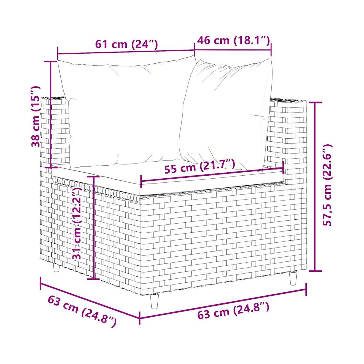 - Dimensiones del cojín del respaldo (M): 61 x 38 cm (ancho x profundo)