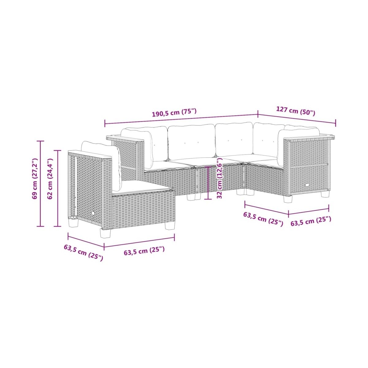 - Dimensiones del cojín del asiento (esquina): 56,5 x 56,5 x 3 cm (ancho x profundo x grosor)