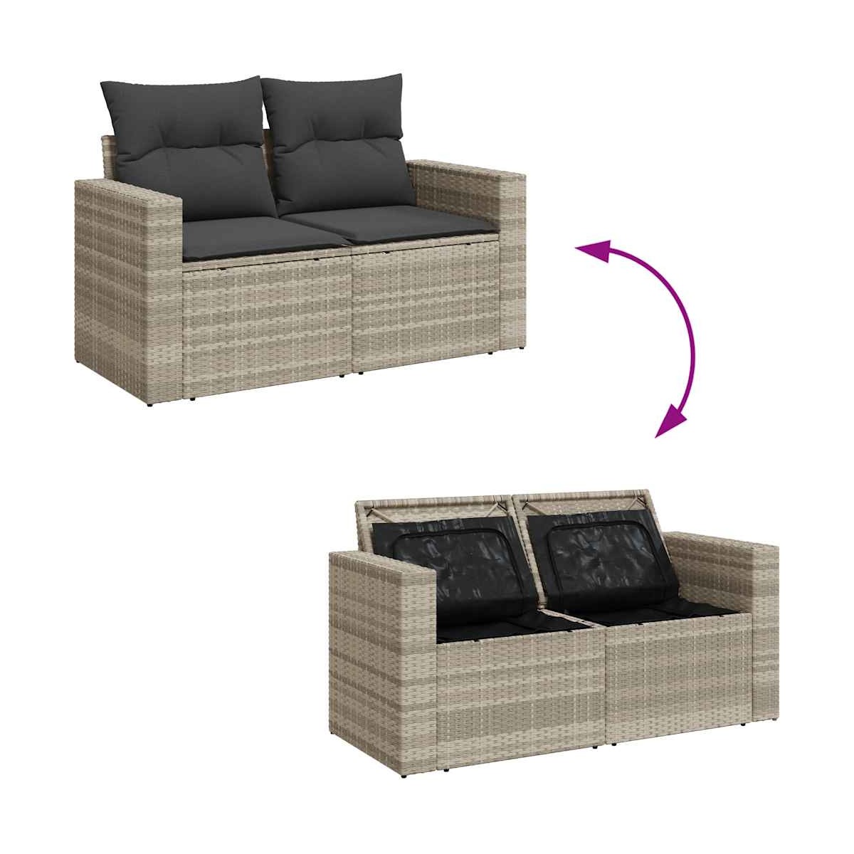 Este conjunto de sofás de jardín es el complemento perfecto para el jardín, terraza o patio, ya que proporciona un espacio confortable y acogedor para charlar con familiares y amigos o simplemente relajarte y disfrutar del aire libre. Material duradero: El ratán sintético, también conocido como ratán sintético, es un material sintético resistente y de bajo mantenimiento que se parece al ratán natural. Es ligero, fácil de limpiar y se usa comúnmente para muebles de exterior debido a su durabilidad y propiedades resistentes a la intemperie.Función de almacenamiento con bolsa resistente al agua: El mueble de jardín cuenta con espacio de almacenamiento debajo del asiento, completo con una bolsa resistente al agua para guardar cojines, juguetes y otros artículos. La bolsa interior se puede sujetar de forma segura a los muebles de exterior con cierres de gancho y bucle para mayor estabilidad.Reposapiés versátil: El taburete es versátil y sirve como un cómodo reposapiés para cuando descanses en el sofá o como asiento adicional en tu jardín.Funda desenfundable y lavable: Estos cojines de asiento cuentan con fundas desenfundables para facilitar el lavado y mantenimiento.Diseño modular: Este conjunto de muebles de exterior tiene un diseño modular, por lo que es completamente flexible y fácil de mover, para que puedas crear una disposición de muebles de exterior personalizada. Información útil:Para asegurarte de que tus muebles de exterior se mantengan hermosos, recomendamos protegerlos con una funda impermeable.