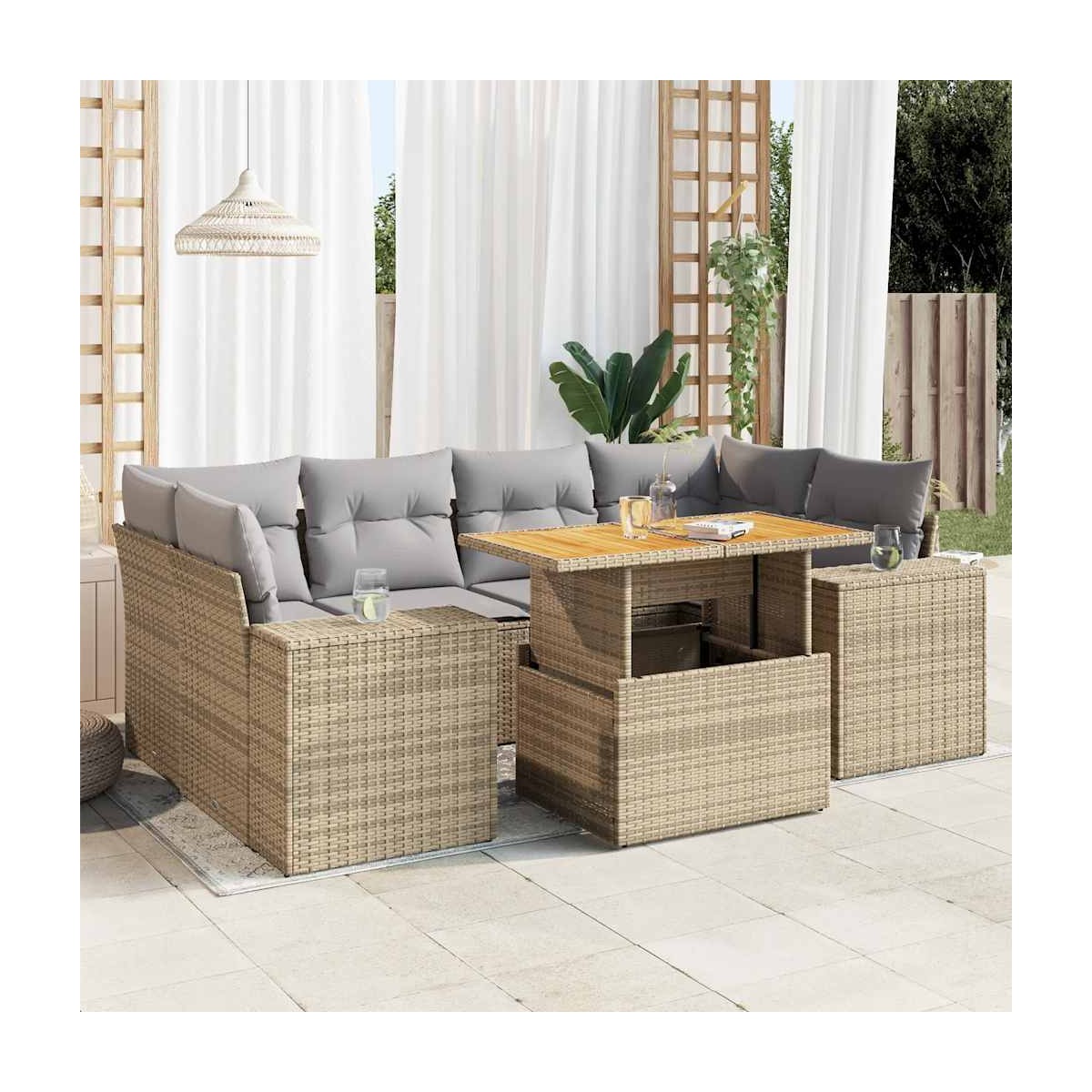 Este conjunto de sofás de jardín es el complemento perfecto para el jardín, terraza o patio, ya que proporciona un espacio confortable y acogedor para charlar con familiares y amigos o simplemente relajarte y disfrutar del aire libre. Material duradero: El ratán sintético, también conocido como ratán sintético, es un material sintético resistente y de bajo mantenimiento que se parece al ratán natural. Es ligero, fácil de limpiar y se usa comúnmente para muebles de exterior debido a su durabilidad y propiedades resistentes a la intemperie.Función de almacenamiento con bolsa resistente al agua: El mueble de jardín cuenta con espacio de almacenamiento debajo del asiento, completo con una bolsa resistente al agua para guardar cojines, juguetes y otros artículos. La bolsa interior se puede sujetar de forma segura a los muebles de exterior con cierres de gancho y bucle para mayor estabilidad.Tablero ajustable: El tablero de la mesa se puede levantar para que la mesa sea más alta, lo que transforma la mesa al aire libre de una mesa de café a una mesa de comedor. Es perfecto para invitar a invitados o comer al aire libre.Funda desenfundable y lavable: Estos cojines de asiento cuentan con fundas desenfundables para facilitar el lavado y mantenimiento.Diseño modular: Este conjunto de muebles de exterior tiene un diseño modular, por lo que es completamente flexible y fácil de mover, para que puedas crear una disposición de muebles de exterior personalizada. Información útil:Para asegurarte de que tus muebles de exterior se mantengan hermosos, recomendamos protegerlos con una funda impermeable.