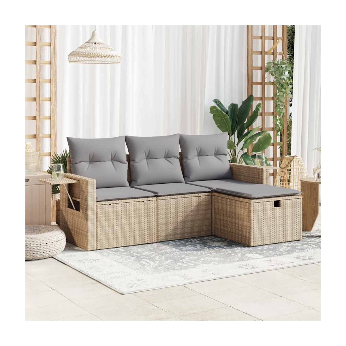 Este conjunto de sofás de jardín es el complemento perfecto para el jardín, terraza o patio, ya que proporciona un espacio confortable y acogedor para charlar con familiares y amigos o simplemente relajarte y disfrutar del aire libre. Material duradero: El ratán sintético, también conocido como ratán sintético, es un material sintético resistente y de bajo mantenimiento que se parece al ratán natural. Es ligero, fácil de limpiar y se usa comúnmente para muebles de exterior debido a su durabilidad y propiedades resistentes a la intemperie.Función de almacenamiento con bolsa resistente al agua: El mueble de jardín cuenta con espacio de almacenamiento debajo del asiento, completo con una bolsa resistente al agua para guardar cojines, juguetes y otros artículos. La bolsa interior se puede sujetar de forma segura a los muebles de exterior con cierres de gancho y bucle para mayor estabilidad.Reposapiés versátil: El taburete es versátil y sirve como un cómodo reposapiés para cuando descanses en el sofá o como asiento adicional en tu jardín.Funda desenfundable y lavable: Estos cojines de asiento cuentan con fundas desenfundables para facilitar el lavado y mantenimiento.Diseño modular: Este conjunto de muebles de exterior tiene un diseño modular, por lo que es completamente flexible y fácil de mover, para que puedas crear una disposición de muebles de exterior personalizada. Información útil:Para asegurarte de que tus muebles de exterior se mantengan hermosos, recomendamos protegerlos con una funda impermeable.