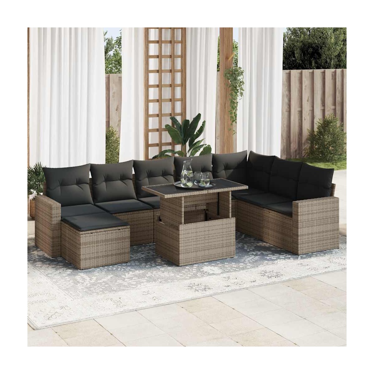 Este conjunto de sofás de jardín es el complemento perfecto para el jardín, terraza o patio, ya que proporciona un espacio confortable y acogedor para charlar con familiares y amigos o simplemente relajarte y disfrutar del aire libre. Material duradero: El ratán sintético, también conocido como ratán sintético, es un material sintético resistente y de bajo mantenimiento que se parece al ratán natural. Es ligero, fácil de limpiar y se usa comúnmente para muebles de exterior debido a su durabilidad y propiedades resistentes a la intemperie.Función de almacenamiento con bolsa resistente al agua: Cada asiento de jardín cuenta con un espacio de almacenamiento debajo del asiento, completo con una bolsa resistente al agua para guardar cojines, juguetes y otros artículos. La bolsa interior tiene una cubierta superior y se puede sujetar de forma segura al asiento con cierres de gancho y bucle para mayor estabilidad.Tablero ajustable: El tablero de la mesa se puede levantar para que la mesa sea más alta, lo que transforma la mesa al aire libre de una mesa de café a una mesa de comedor. Es perfecto para invitar a invitados o comer al aire libre.Reposapiés versátil: El taburete es versátil y sirve como un cómodo reposapiés para cuando descanses en el sofá o como asiento adicional en tu jardín.Funda desenfundable y lavable: Estos cojines de asiento cuentan con fundas desenfundables para facilitar el lavado y mantenimiento.Estructura robusta y estable: La estructura de acero con recubrimiento en polvo es fuerte, estable, duradero y resistente a la corrosión y a las inclemencias del tiempo, lo que garantiza un rendimiento duradero. Información útil:Para asegurarte de que tus muebles de exterior se mantengan hermosos, recomendamos protegerlos con una funda impermeable.