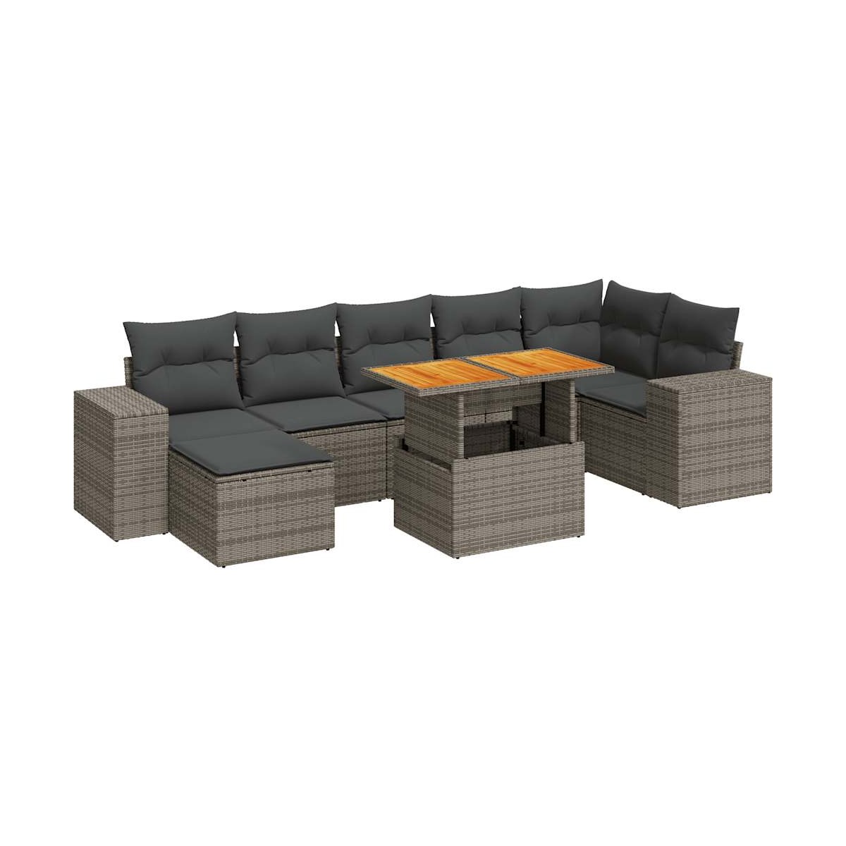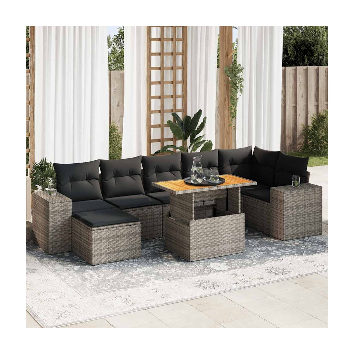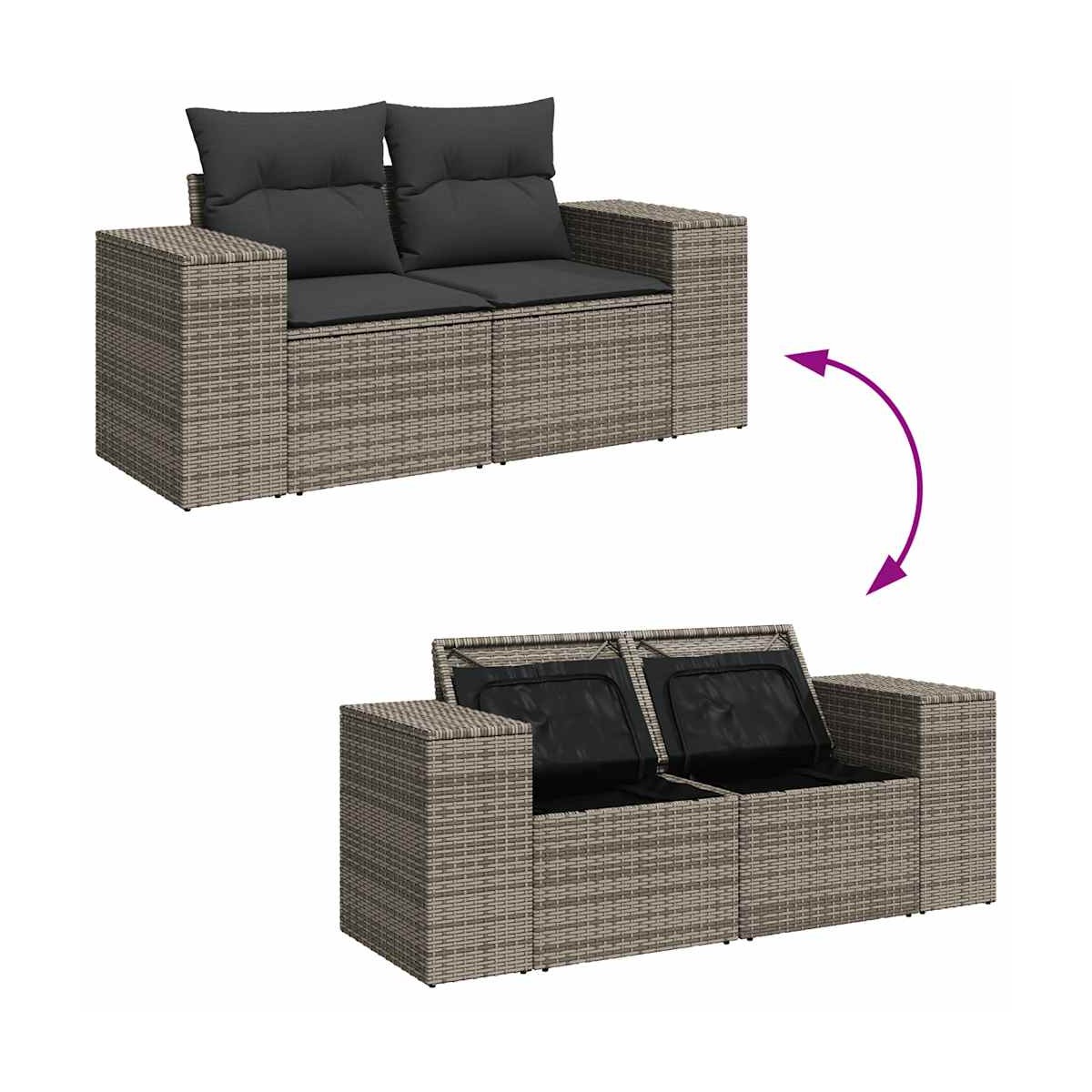 Este conjunto de sofás de jardín es el complemento perfecto para el jardín, terraza o patio, ya que proporciona un espacio confortable y acogedor para charlar con familiares y amigos o simplemente relajarte y disfrutar del aire libre. Material duradero: El ratán sintético, también conocido como ratán sintético, es un material sintético resistente y de bajo mantenimiento que se parece al ratán natural. Es ligero, fácil de limpiar y se usa comúnmente para muebles de exterior debido a su durabilidad y propiedades resistentes a la intemperie.Función de almacenamiento con bolsa resistente al agua: El mueble de jardín cuenta con espacio de almacenamiento debajo del asiento, completo con una bolsa resistente al agua para guardar cojines, juguetes y otros artículos. La bolsa interior se puede sujetar de forma segura a los muebles de exterior con cierres de gancho y bucle para mayor estabilidad.Tablero ajustable: El tablero de la mesa se puede levantar para que la mesa sea más alta, lo que transforma la mesa al aire libre de una mesa de café a una mesa de comedor. Es perfecto para invitar a invitados o comer al aire libre.Funda desenfundable y lavable: Estos cojines de asiento cuentan con fundas desenfundables para facilitar el lavado y mantenimiento.Diseño modular: Este conjunto de muebles de exterior tiene un diseño modular, por lo que es completamente flexible y fácil de mover, para que puedas crear una disposición de muebles de exterior personalizada. Información útil:Para asegurarte de que tus muebles de exterior se mantengan hermosos, recomendamos protegerlos con una funda impermeable.