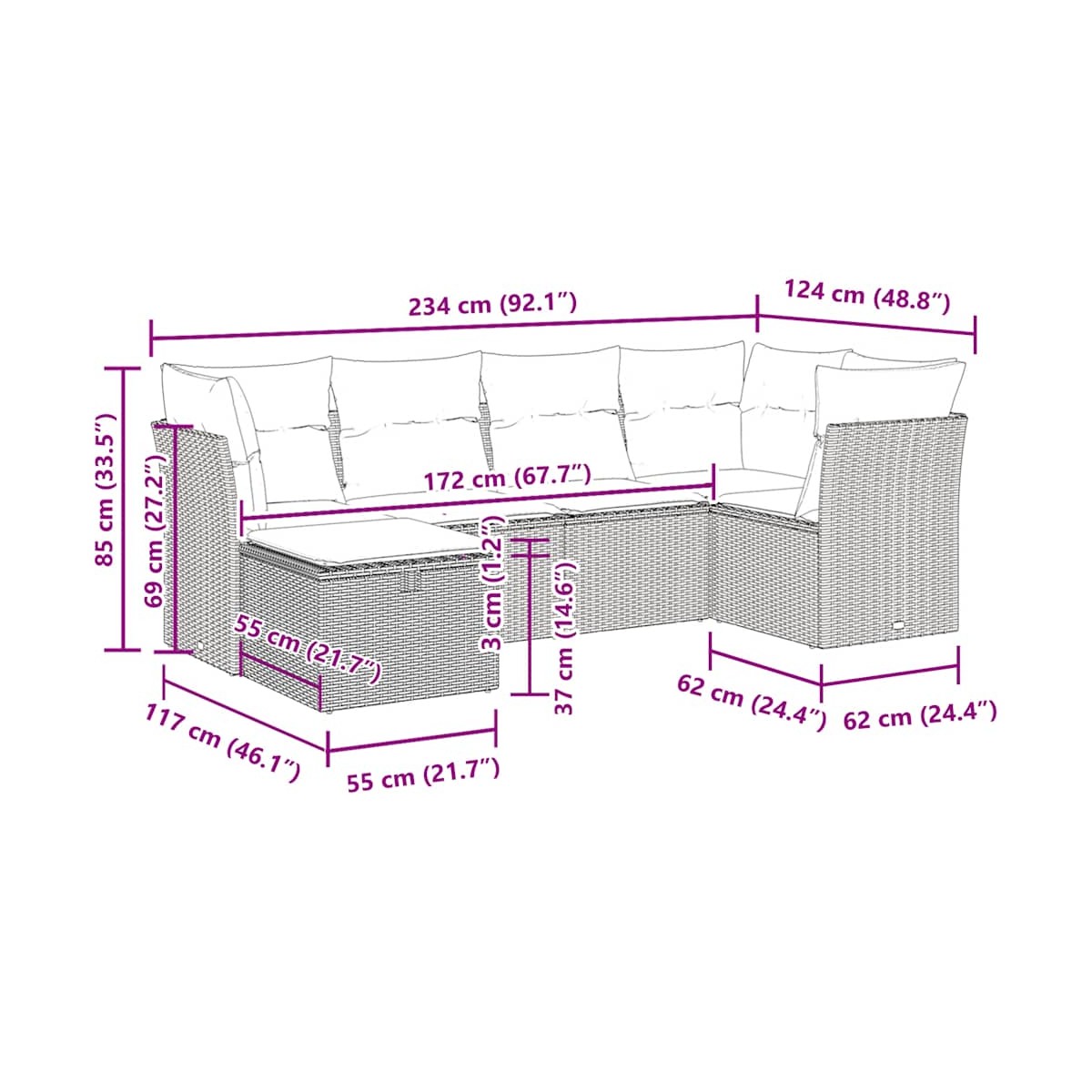 - Dimensiones del cojín de respaldo: 55 x 45 x 13 cm (largo x ancho x profundo)