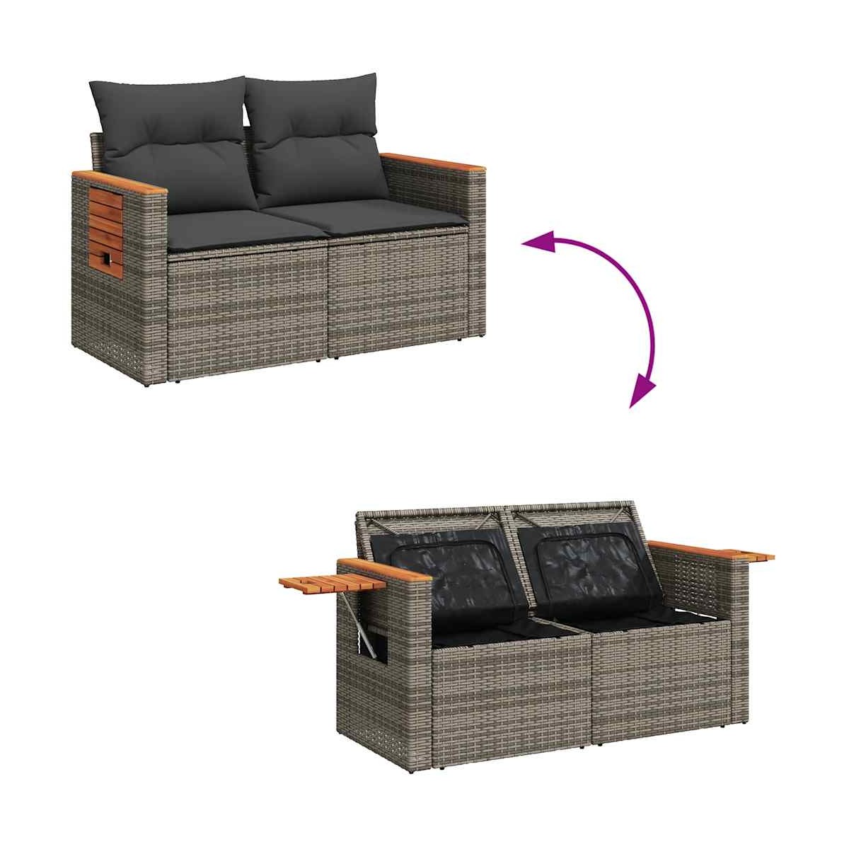 Este conjunto de sofás de jardín es el complemento perfecto para el jardín, terraza o patio, ya que proporciona un espacio confortable y acogedor para charlar con familiares y amigos o simplemente relajarte y disfrutar del aire libre.Material duradero: El ratán sintético, también conocido como ratán sintético, es un material sintético resistente y de bajo mantenimiento que se parece al ratán natural. Es ligero, fácil de limpiar y se usa comúnmente para muebles de exterior debido a su durabilidad y propiedades resistentes a la intemperie.Función de almacenamiento con bolsa resistente al agua: Cada asiento de jardín cuenta con un espacio de almacenamiento debajo del asiento, completo con una bolsa resistente al agua para guardar cojines, juguetes y otros artículos. Las bolsas interiores tienen una cubierta superior y se pueden sujetar de forma segura a los asientos con cierres de gancho y bucle para mayor estabilidad.Cómoda mesa auxiliar: Este mueble de exterior cuenta con una mesa auxiliar plegable con un muelle de gas, lo que proporciona un lugar práctico para mantener tus elementos esenciales al alcance de la mano.Funda desenfundable y lavable: Estos cojines de asiento cuentan con fundas desenfundables para facilitar el lavado y mantenimiento.Diseño modular: Este conjunto de muebles de exterior tiene un diseño modular, por lo que es completamente flexible y fácil de mover, para que puedas crear una disposición de muebles de exterior personalizada.Información útil:Para asegurarte de que tus muebles de exterior se mantengan hermosos, recomendamos protegerlos con una funda impermeable.