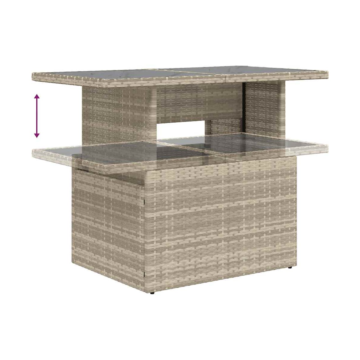 Este conjunto de sofás de jardín es el complemento perfecto para el jardín, terraza o patio, ya que proporciona un espacio confortable y acogedor para charlar con familiares y amigos o simplemente relajarte y disfrutar del aire libre. Material duradero: El ratán sintético, también conocido como ratán sintético, es un material sintético resistente y de bajo mantenimiento que se parece al ratán natural. Es ligero, fácil de limpiar y se usa comúnmente para muebles de exterior debido a su durabilidad y propiedades resistentes a la intemperie.Tablero ajustable: El tablero de la mesa se puede levantar para que la mesa sea más alta, lo que transforma la mesa al aire libre de una mesa de café a una mesa de comedor. Es perfecto para invitar a invitados o comer al aire libre.Experiencia de asiento cómoda: Estos muebles de exterior, completos con cojines acolchados gruesos, ofrecen una experiencia de asiento cómoda.Funda desenfundable y lavable: Estos cojines de asiento cuentan con fundas desenfundables para facilitar el lavado y mantenimiento.Diseño modular: Este conjunto de muebles de exterior tiene un diseño modular, por lo que es completamente flexible y fácil de mover, para que puedas crear una disposición de muebles de exterior personalizada. Información útil:Para asegurarte de que tus muebles de exterior se mantengan hermosos, recomendamos protegerlos con una funda impermeable.