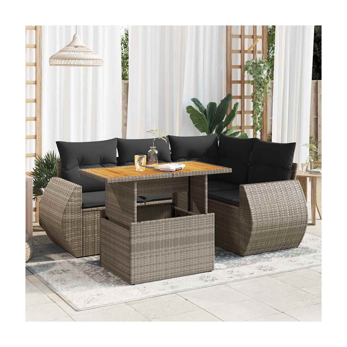 Este conjunto de sofás de jardín es el complemento perfecto para el jardín, terraza o patio, ya que proporciona un espacio confortable y acogedor para charlar con familiares y amigos o simplemente relajarte y disfrutar del aire libre. Material duradero: El ratán sintético, también conocido como ratán sintético, es un material sintético resistente y de bajo mantenimiento que se parece al ratán natural. Es ligero, fácil de limpiar y se usa comúnmente para muebles de exterior debido a su durabilidad y propiedades resistentes a la intemperie.Función de almacenamiento con bolsa resistente al agua: El mueble de jardín cuenta con espacio de almacenamiento debajo del asiento, completo con una bolsa resistente al agua para guardar cojines, juguetes y otros artículos. La bolsa interior se puede sujetar de forma segura a los muebles de exterior con cierres de gancho y bucle para mayor estabilidad.Tablero ajustable: El tablero de la mesa se puede levantar para que la mesa sea más alta, lo que transforma la mesa al aire libre de una mesa de café a una mesa de comedor. Es perfecto para invitar a invitados o comer al aire libre.Funda desenfundable y lavable: Estos cojines de asiento cuentan con fundas desenfundables para facilitar el lavado y mantenimiento.Diseño modular: Este conjunto de muebles de exterior tiene un diseño modular, por lo que es completamente flexible y fácil de mover, para que puedas crear una disposición de muebles de exterior personalizada. Información útil:Para asegurarte de que tus muebles de exterior se mantengan hermosos, recomendamos protegerlos con una funda impermeable.