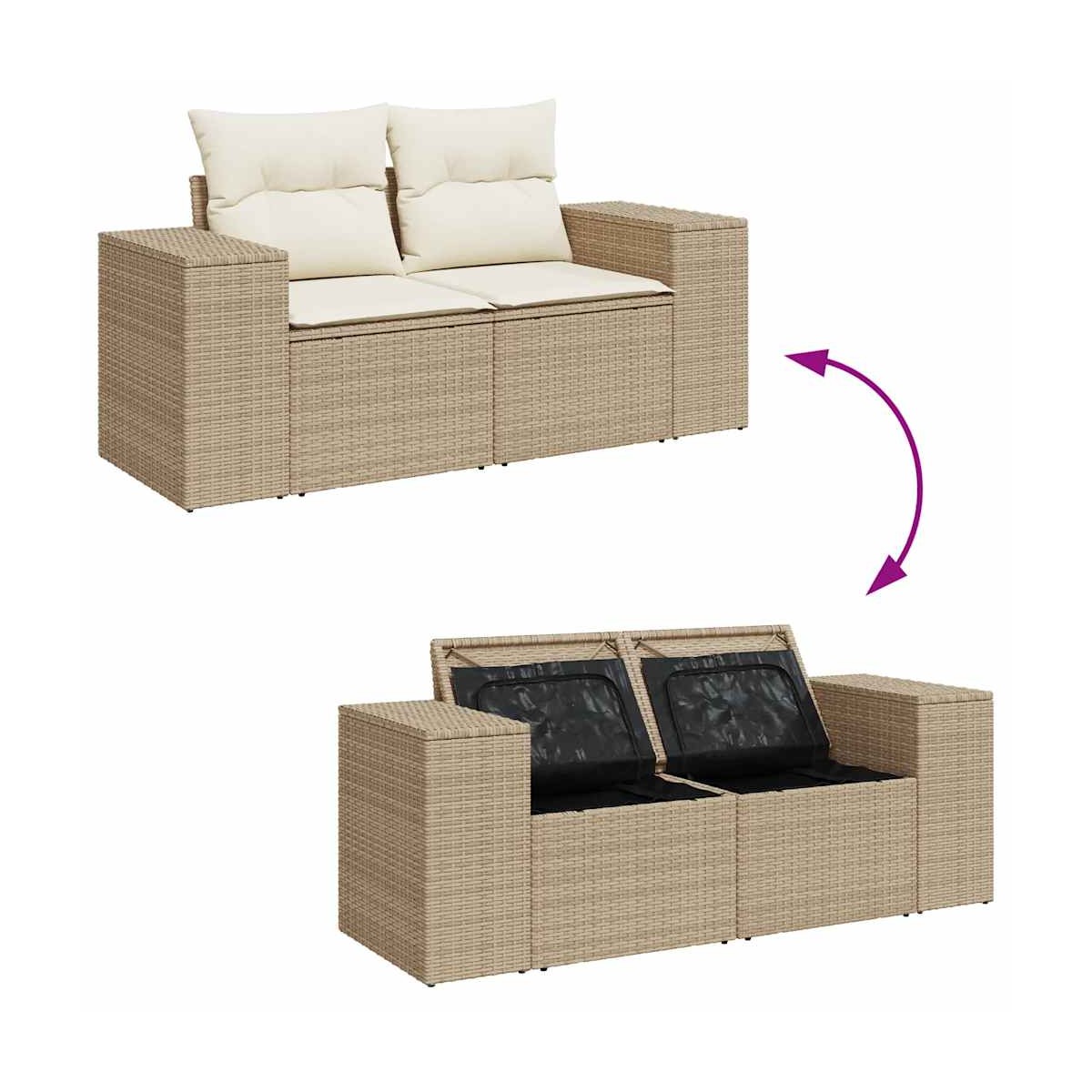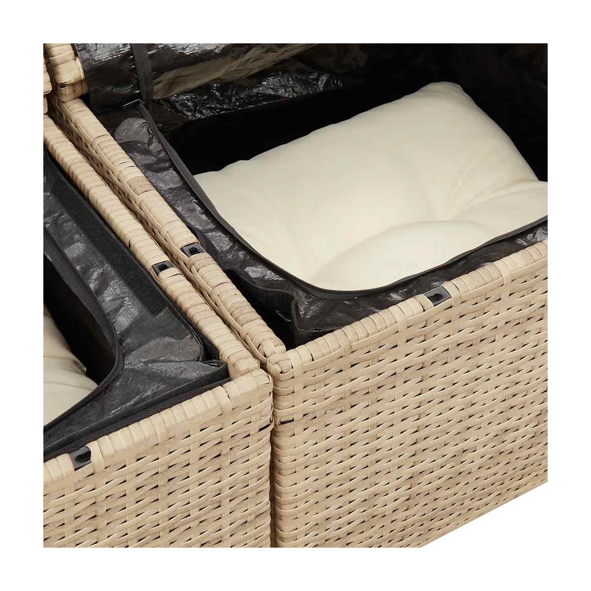Este conjunto de sofás de jardín es el complemento perfecto para el jardín, terraza o patio, ya que proporciona un espacio confortable y acogedor para charlar con familiares y amigos o simplemente relajarte y disfrutar del aire libre. Material duradero: El ratán sintético, también conocido como ratán sintético, es un material sintético resistente y de bajo mantenimiento que se parece al ratán natural. Es ligero, fácil de limpiar y se usa comúnmente para muebles de exterior debido a su durabilidad y propiedades resistentes a la intemperie.Función de almacenamiento con bolsa resistente al agua: El mueble de jardín cuenta con espacio de almacenamiento debajo del asiento, completo con una bolsa resistente al agua para guardar cojines, juguetes y otros artículos. La bolsa interior se puede sujetar de forma segura a los muebles de exterior con cierres de gancho y bucle para mayor estabilidad.Tablero ajustable: El tablero de la mesa se puede levantar para que la mesa sea más alta, lo que transforma la mesa al aire libre de una mesa de café a una mesa de comedor. Es perfecto para invitar a invitados o comer al aire libre.Funda desenfundable y lavable: Estos cojines de asiento cuentan con fundas desenfundables para facilitar el lavado y mantenimiento.Diseño modular: Este conjunto de muebles de exterior tiene un diseño modular, por lo que es completamente flexible y fácil de mover, para que puedas crear una disposición de muebles de exterior personalizada. Información útil:Para asegurarte de que tus muebles de exterior se mantengan hermosos, recomendamos protegerlos con una funda impermeable.