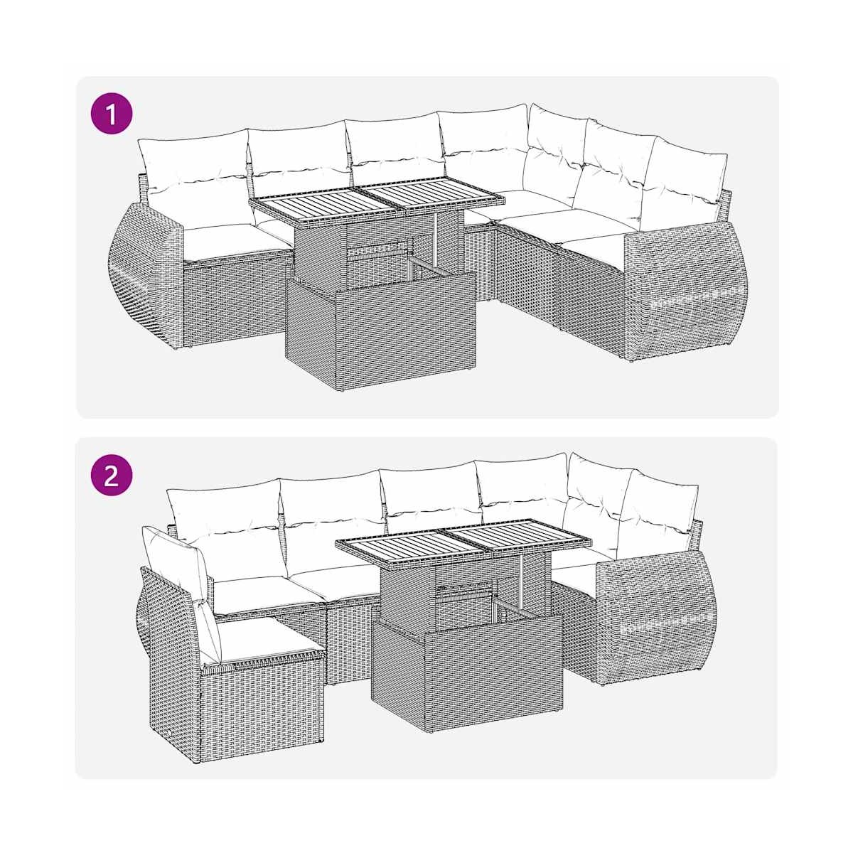 Este conjunto de sofás de jardín es el complemento perfecto para el jardín, terraza o patio, ya que proporciona un espacio confortable y acogedor para charlar con familiares y amigos o simplemente relajarte y disfrutar del aire libre. Material duradero: El ratán sintético, también conocido como ratán sintético, es un material sintético resistente y de bajo mantenimiento que se parece al ratán natural. Es ligero, fácil de limpiar y se usa comúnmente para muebles de exterior debido a su durabilidad y propiedades resistentes a la intemperie.Función de almacenamiento con bolsa resistente al agua: El mueble de jardín cuenta con espacio de almacenamiento debajo del asiento, completo con una bolsa resistente al agua para guardar cojines, juguetes y otros artículos. La bolsa interior se puede sujetar de forma segura a los muebles de exterior con cierres de gancho y bucle para mayor estabilidad.Tablero ajustable: El tablero de la mesa se puede levantar para que la mesa sea más alta, lo que transforma la mesa al aire libre de una mesa de café a una mesa de comedor. Es perfecto para invitar a invitados o comer al aire libre.Funda desenfundable y lavable: Estos cojines de asiento cuentan con fundas desenfundables para facilitar el lavado y mantenimiento.Diseño modular: Este conjunto de muebles de exterior tiene un diseño modular, por lo que es completamente flexible y fácil de mover, para que puedas crear una disposición de muebles de exterior personalizada. Información útil:Para asegurarte de que tus muebles de exterior se mantengan hermosos, recomendamos protegerlos con una funda impermeable.