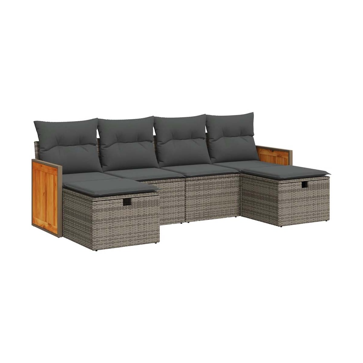 Este conjunto de sofás de jardín es el complemento perfecto para el jardín, terraza o patio, ya que proporciona un espacio confortable y acogedor para charlar con familiares y amigos o simplemente relajarte y disfrutar del aire libre. Material duradero: El ratán sintético, también conocido como ratán sintético, es un material sintético resistente y de bajo mantenimiento que se parece al ratán natural. Es ligero, fácil de limpiar y se usa comúnmente para muebles de exterior debido a su durabilidad y propiedades resistentes a la intemperie.Función de almacenamiento con bolsa resistente al agua: Cada asiento de jardín cuenta con un espacio de almacenamiento debajo del asiento, completo con una bolsa resistente al agua para guardar cojines, juguetes y otros artículos. La bolsa interior tiene una cubierta superior y se puede sujetar de forma segura al asiento con cierres de gancho y bucle para mayor estabilidad.Reposapiés versátil: El taburete es versátil y sirve como un cómodo reposapiés para cuando descanses en el sofá o como asiento adicional en tu jardín.Funda desenfundable y lavable: Estos cojines de asiento cuentan con fundas desenfundables para facilitar el lavado y mantenimiento.Estructura robusta y estable: La estructura de acero con recubrimiento en polvo es fuerte, estable, duradero y resistente a la corrosión y a las inclemencias del tiempo, lo que garantiza un rendimiento duradero. Información útil:Para asegurarte de que tus muebles de exterior se mantengan hermosos, recomendamos protegerlos con una funda impermeable.