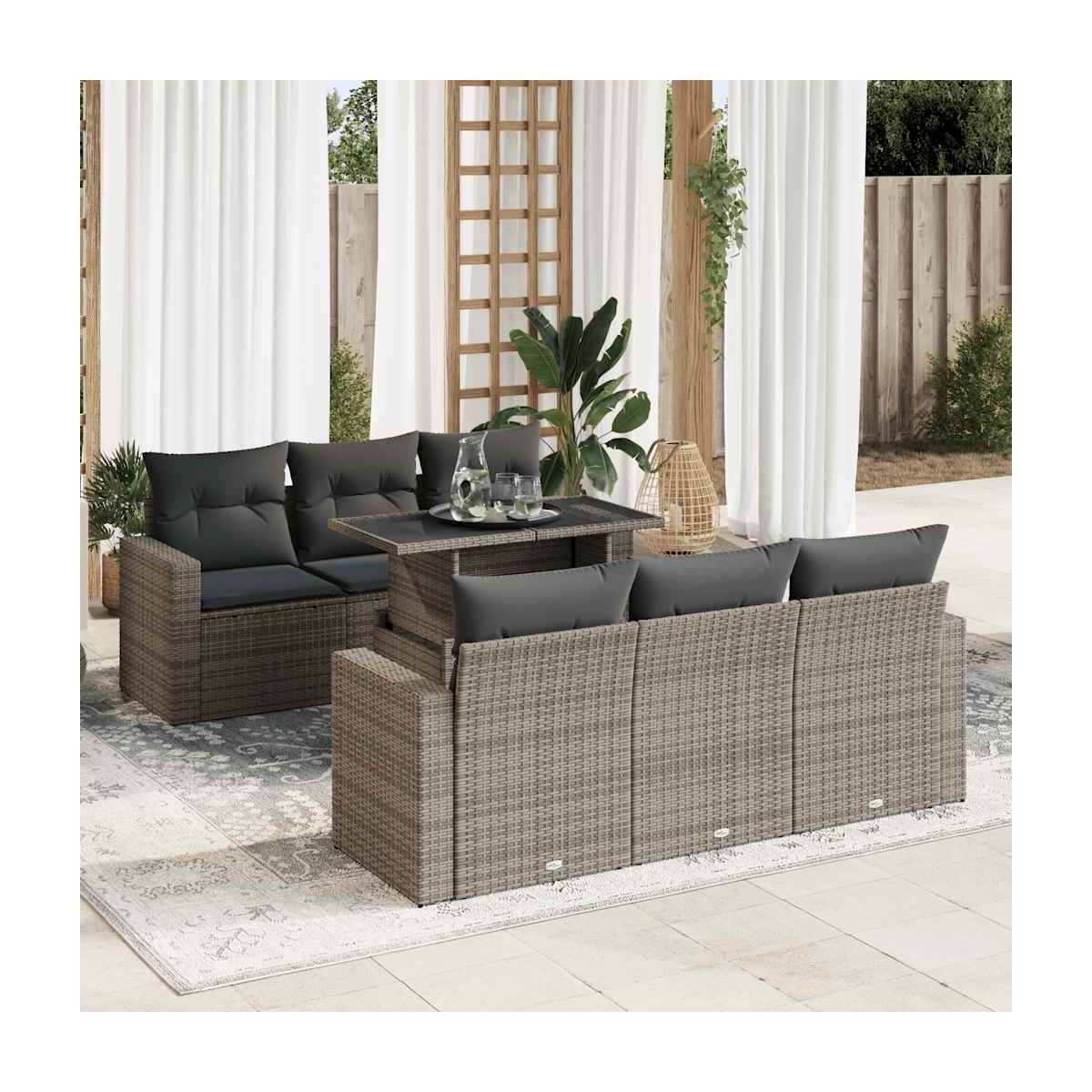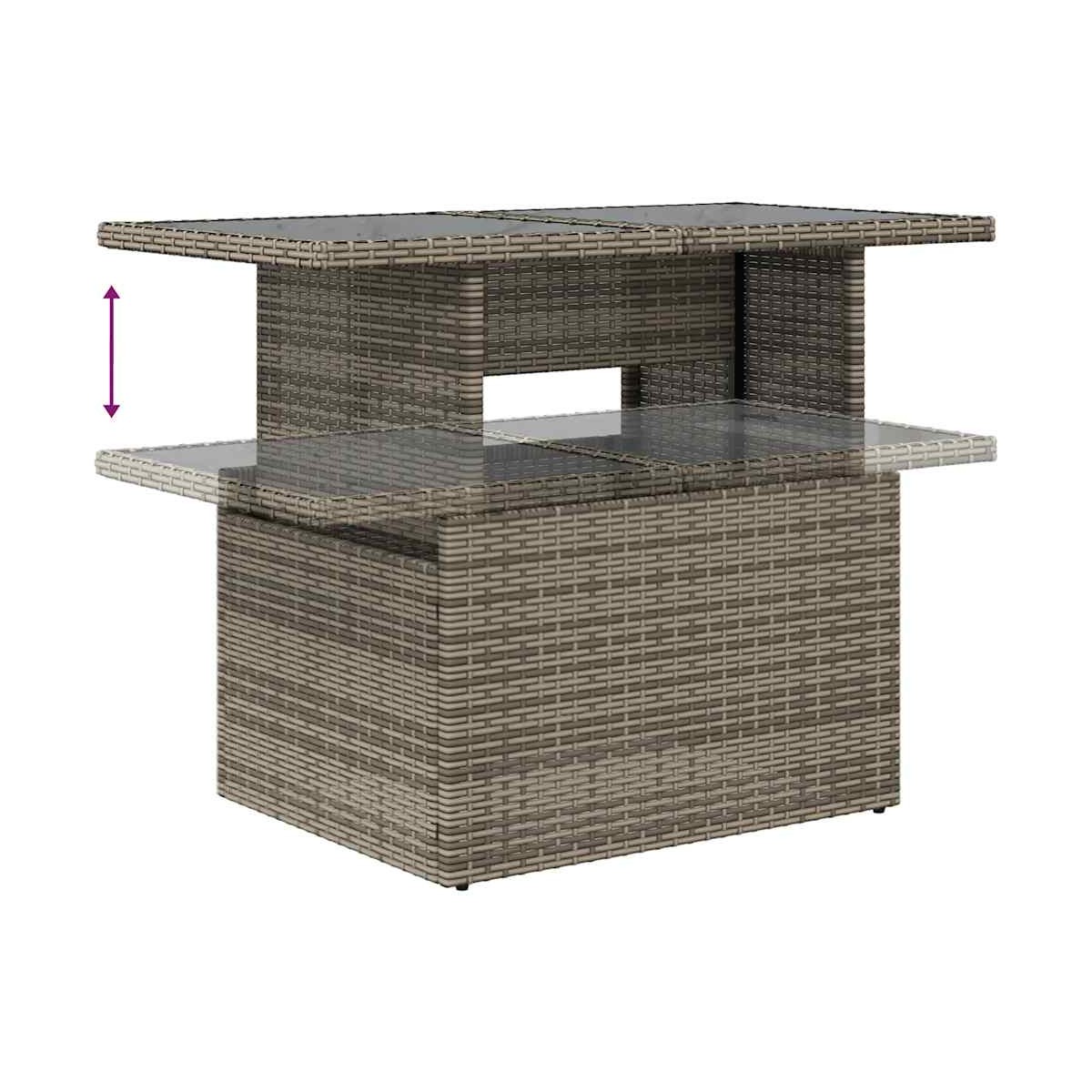 Este conjunto de sofás de jardín es el complemento perfecto para el jardín, terraza o patio, ya que proporciona un espacio confortable y acogedor para charlar con familiares y amigos o simplemente relajarte y disfrutar del aire libre. Material duradero: El ratán sintético, también conocido como ratán sintético, es un material sintético resistente y de bajo mantenimiento que se parece al ratán natural. Es ligero, fácil de limpiar y se usa comúnmente para muebles de exterior debido a su durabilidad y propiedades resistentes a la intemperie.Función de almacenamiento con bolsa resistente al agua: Cada asiento de jardín cuenta con un espacio de almacenamiento debajo del asiento, completo con una bolsa resistente al agua para guardar cojines, juguetes y otros artículos. La bolsa interior tiene una cubierta superior y se puede sujetar de forma segura al asiento con cierres de gancho y bucle para mayor estabilidad.Tablero ajustable: El tablero de la mesa se puede levantar para que la mesa sea más alta, lo que transforma la mesa al aire libre de una mesa de café a una mesa de comedor. Es perfecto para invitar a invitados o comer al aire libre.Funda desenfundable y lavable: Estos cojines de asiento cuentan con fundas desenfundables para facilitar el lavado y mantenimiento.Estructura robusta y estable: La estructura de acero con recubrimiento en polvo es fuerte, estable, duradero y resistente a la corrosión y a las inclemencias del tiempo, lo que garantiza un rendimiento duradero. Información útil:Para asegurarte de que tus muebles de exterior se mantengan hermosos, recomendamos protegerlos con una funda impermeable.